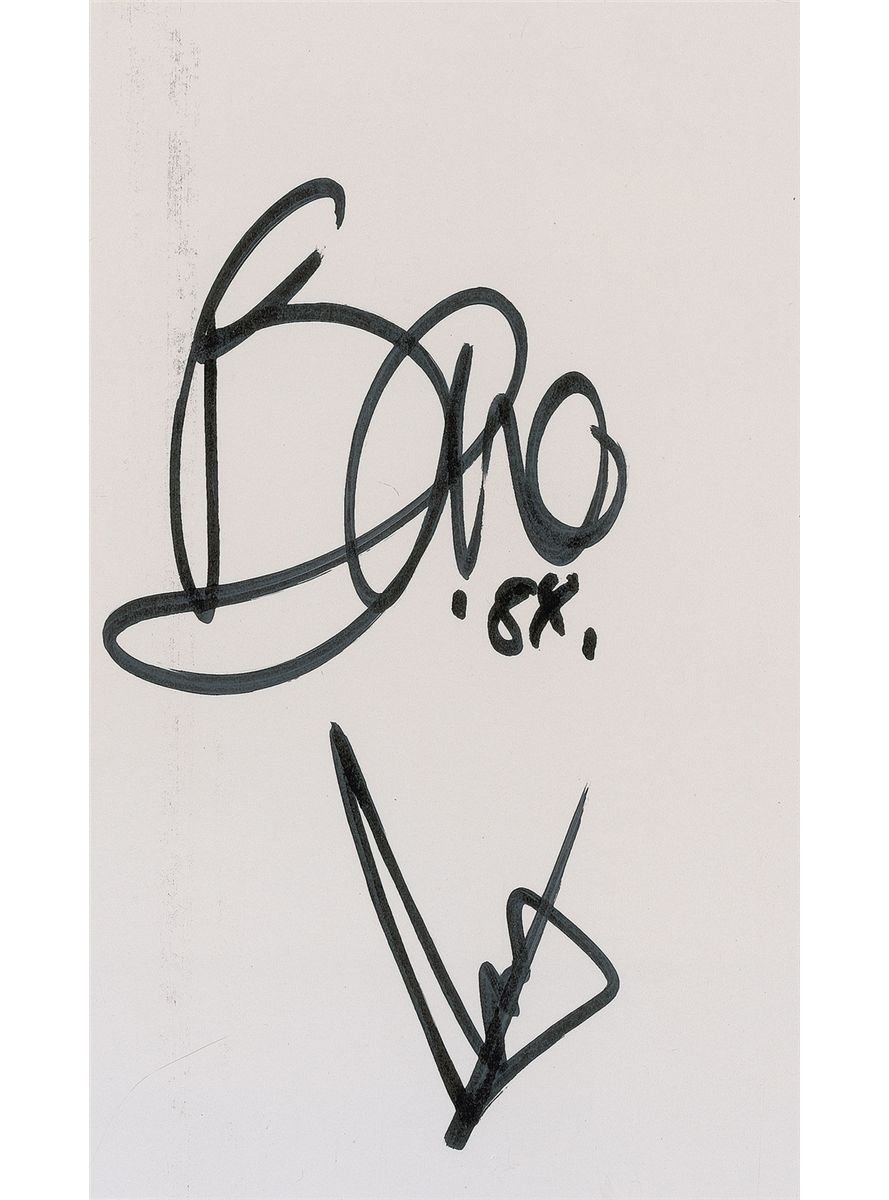 Large felt tip signatures of U2 on two off-white 4.75 x 7.75 cards, one signed “Bono ’88” and “Larry” and the other signed “Edge” and “Adam Clayton.” In overall fine condition.