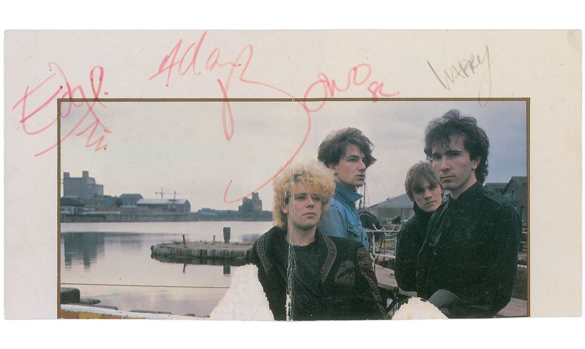 Color postcard for October, the second studio album from U2, 6.5 x 3.25, signed along the upper border in red and black ink, “Edge,” “Adam,” “Bono 82,” and “Larry.” In very good condition, with signatures a shade or two light, the lower portion of the image trimmed off, a central vertical fold (passing through the first letter of Bono’s signature), and two areas of surface loss along lower edge.