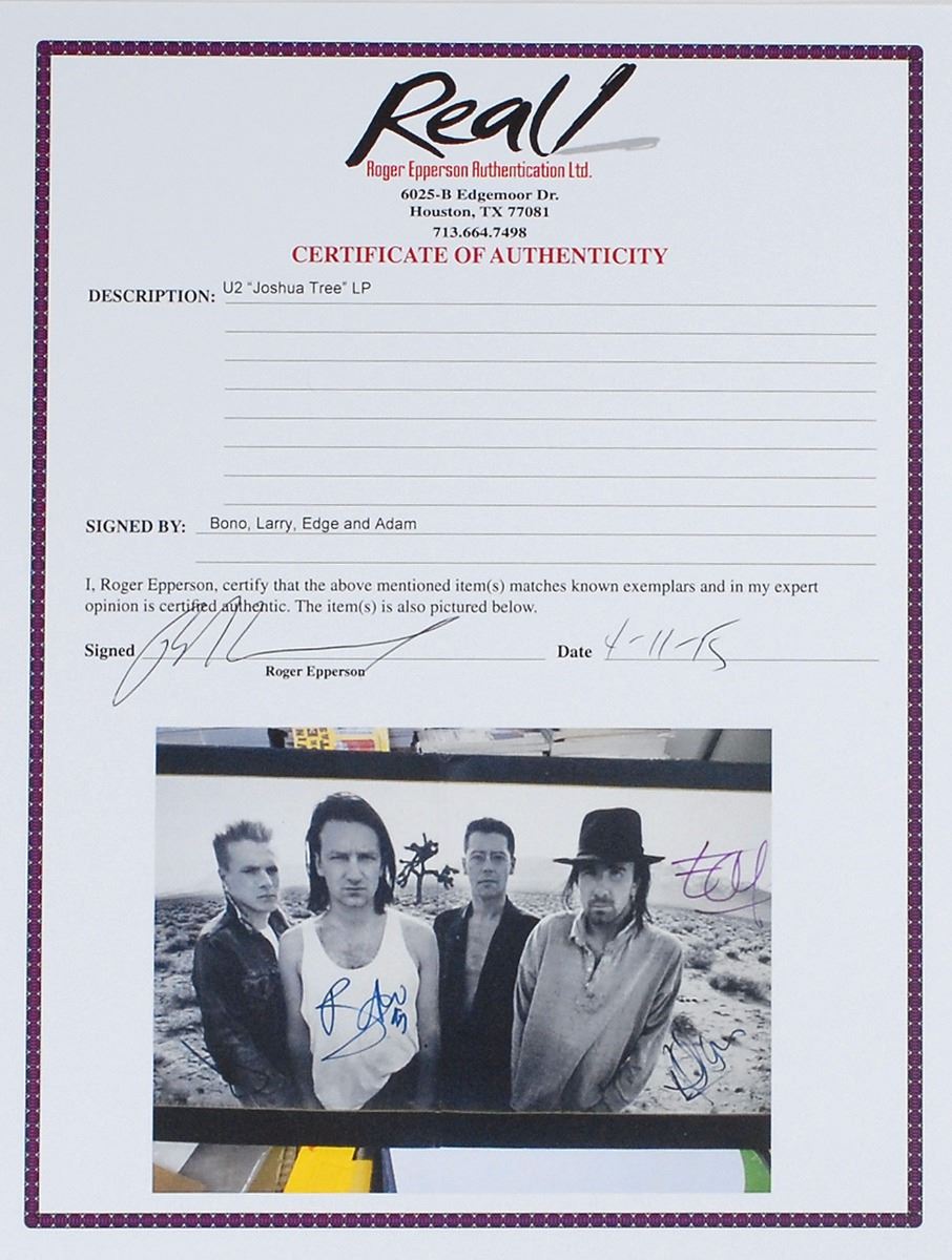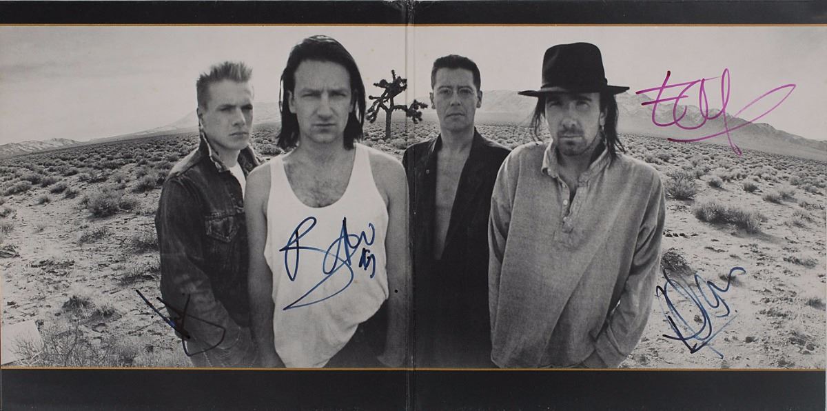 The Joshua Tree album signed on the inside gatefold in black felt tip by Bono, Larry Mullen, Jr., and Adam Clayton, and in red felt tip by Edge, all signing first names only. In fine condition, with trivial foxing to inside gatefold, slight edgewear, and adhesive remnants from removed price tag to upper right corner of the front cover. The record is not included. Accompanied by a full letter of authenticity from REAL. Consignor notes that the signatures were obtained outside London’s Mayfair Hotel during the Zooropa tour in late August 1993.