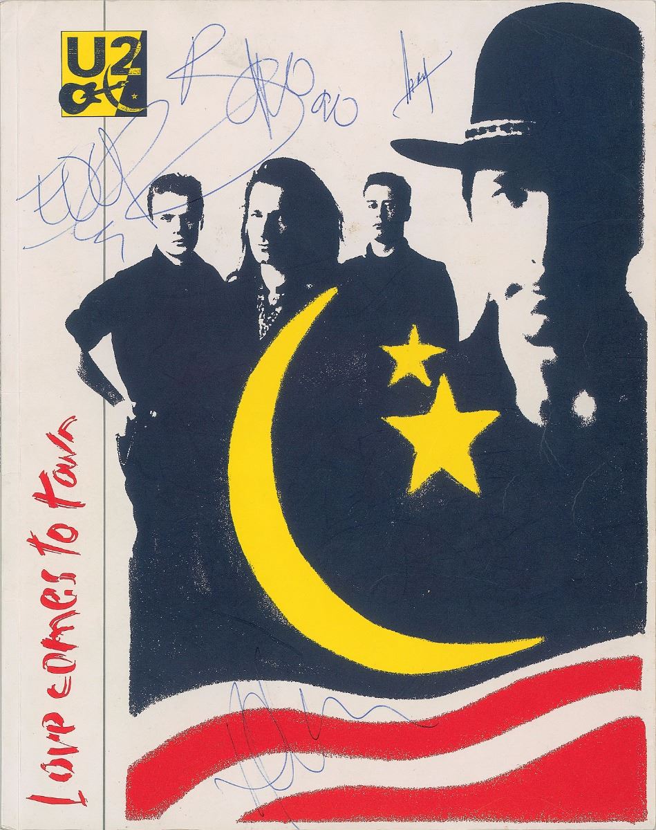 Attractive tour book from U2’s 1989-90 Lovetown Tour, 9.75 x 12.25, 48 pages, signed on the front cover in blue ballpoint, “Bono 90,” “Edge,” “Larry [Mullen],” and “Adam [Clayton].” In fine condition, with light handling wear. Accompanied by full letters of authenticity from REAL and PSA/DNA.