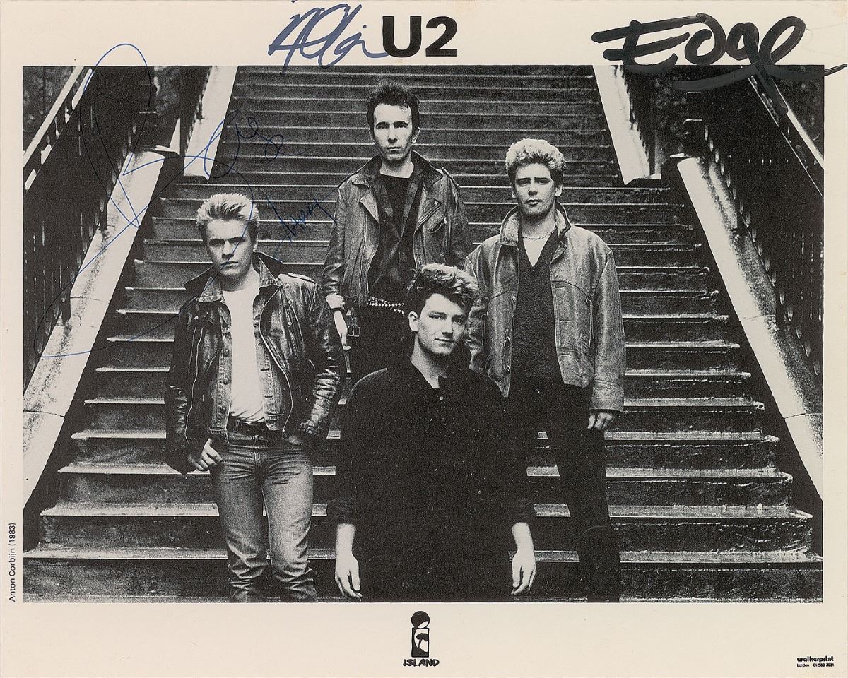 Uncommon 1983 glossy 10 x 8 Island publicity photo of U2 posing on a set of stairs, signed in blue ballpoint, “Bono” and “Larry,” and in black felt tip, “Adam” and “Edge.” In fine condition, with scattered light creases and surface impressions.