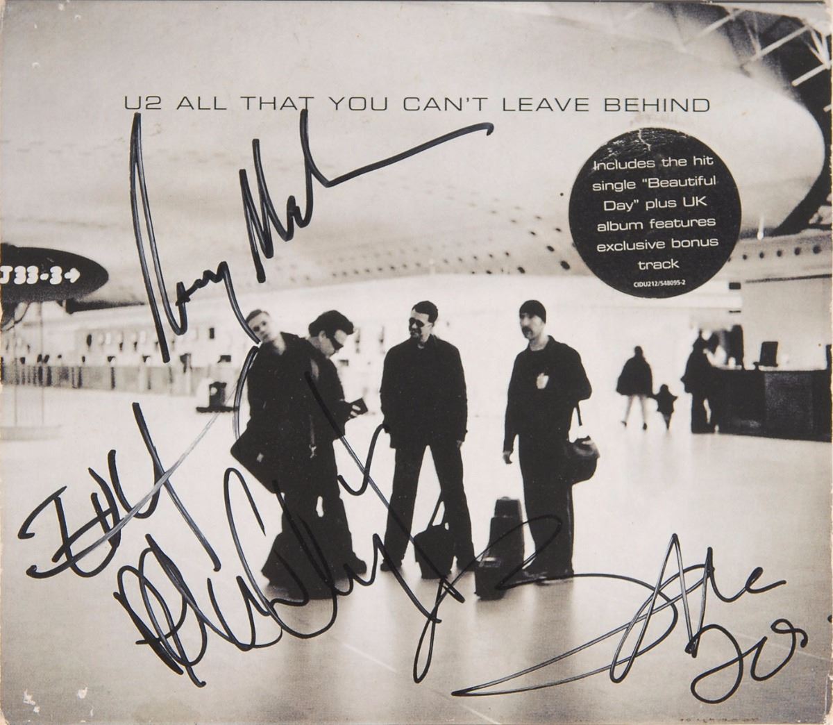All That You Can’t Leave Behind CD signed on the front cover of the slipcase by all members of U2 in black felt tip, “Bono, 2000,” “Larry Mullen,” “Adam Clayton,” and “Edge.” In fine condition, with some light scuffs and gouges to the sleeve. The CD is included. Accompanied by a full letter of authenticity from JSA. Consignor notes that the signatures were obtained at Golden Square’s Virgin Radio in the winter of 2000.