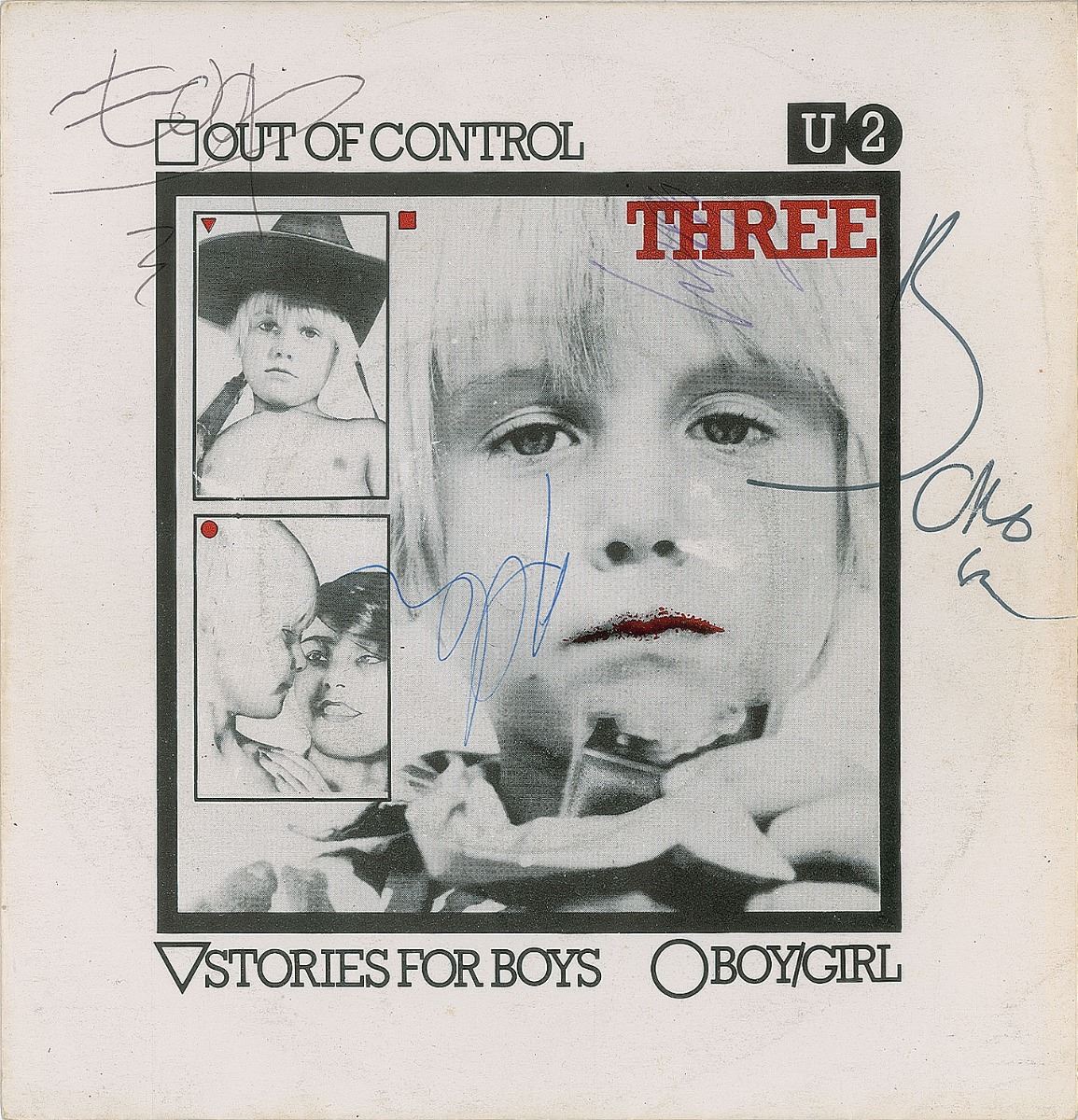 Three 7? EP album signed on the front cover in black felt tip, “Bono,” in black ballpoint, “Edge,” and in blue ballpoint, “Larry” and “Adam.” In fine condition. The record is not included. Accompanied by a full letter of authenticity from REAL.