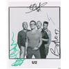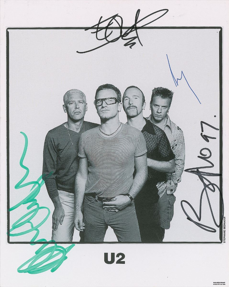 Semi-glossy 8 x 10 paperstock publicity photo of U2, signed in black felt tip, "Edge" and "Bono 97," in blue ink, "Larry," and in green felt tip, "Adam Clayton." In very fine condition. Accompanied by a full letter of authenticity from REAL. Pre-certified REAL.