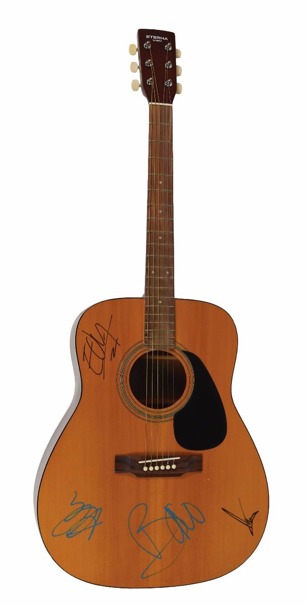 Desirable natural-finish Yamaha Eterna EF-10 right-handed acoustic guitar, signed on the body in blue paint pen by Bono and Adam Clayton, and in black felt tip by Edge and Larry Mullen, each signing first name only. Includes ChromaCast gig bag. In fine condition.