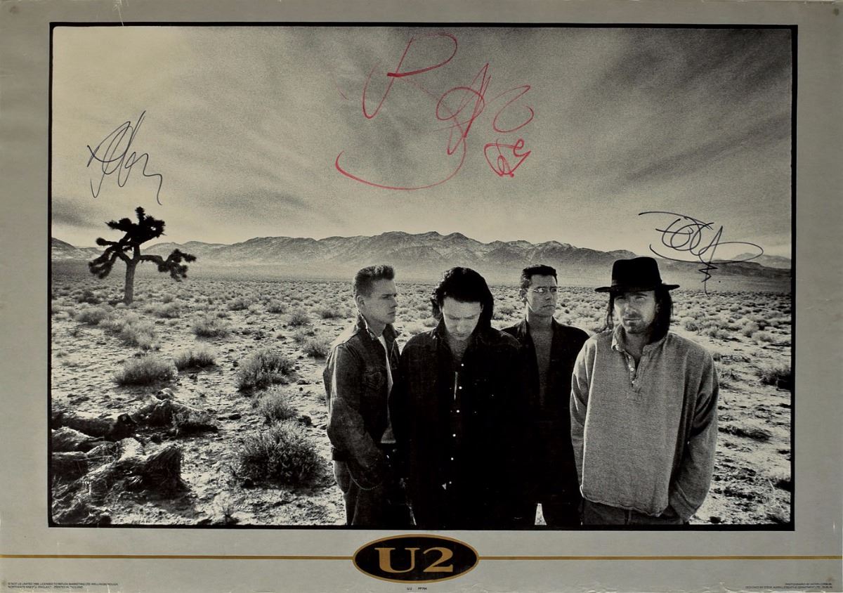 Wonderful poster of U2 posing in Death Valley National Park with the lone iconic Joshua tree in the background, 35 x 24.5, signed in black felt tip, "Adam" and Edge," and in red felt tip, "Bono, 89." Rolled and in fine condition, with scattered light handling wear.