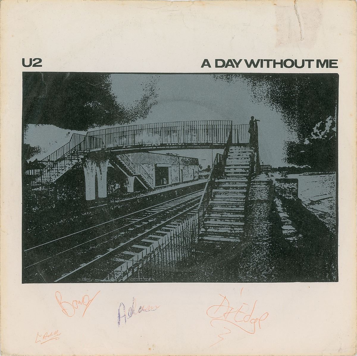 A Day Without Me 'factory sample' single album sleeve signed on the front cover in red ballpoint, "Bono," "Da' Edge," "Larry," and "Adam," who retraced his name in blue ink. In very good to fine condition, with light creasing, a tear to the top edge, and all signatures faded but legible. The record is not included. Accompanied by a full letter of authenticity from REAL, which notes that "Adam went over his name again with blue pen when the red pen quit working." 'A Day Without Me' was released as the lead single from U2's 1980 debut album Boy; these are among the earliest U2 signatures we have ever offered.