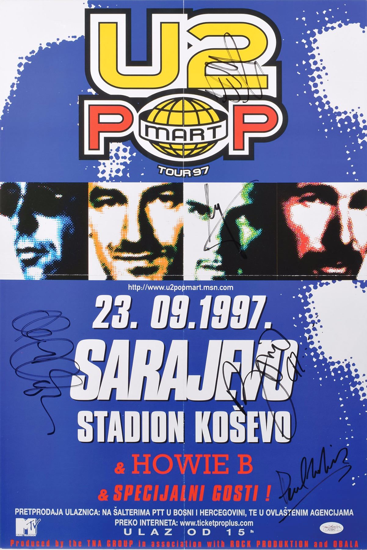 PopMart Tour poster for a U2 concert held at Sarajevo's Stadion Kosevo on September 23, 1997, 15.75 x 23.5, signed in black felt tip, "Bono, 97," "Adam Clayton," "Larry," "Edge," and their manager, "Paul McGuinness." Affixed to a slightly larger cardstock mount. In fine condition, with some bumping to the edges. Accompanied by a full letter of authenticity from JSA.