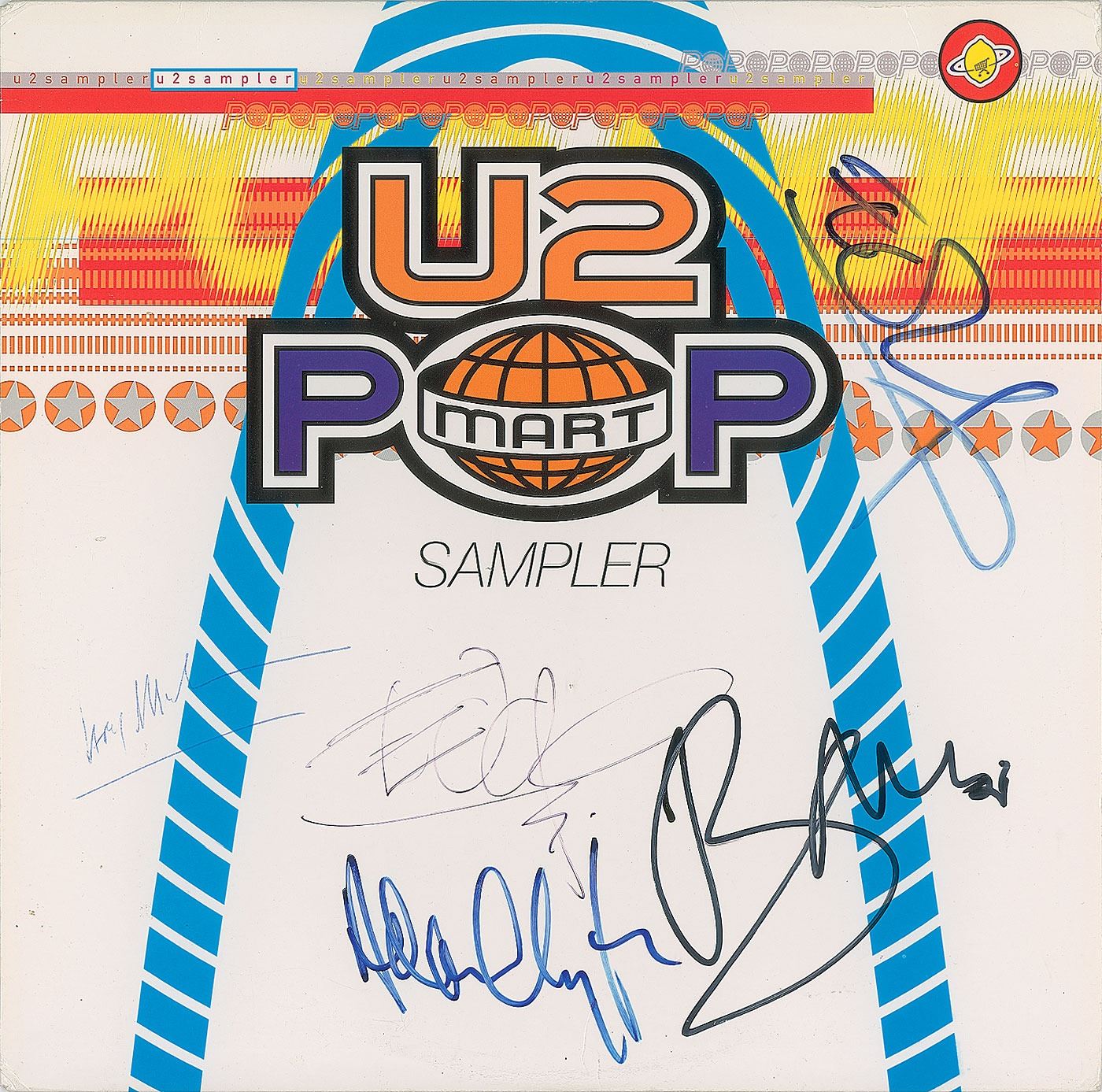 PopMart Tour sampler album signed on the front cover in black ballpoint, "Larry Mullen," in blue felt tip, "Adam Clayton," and in black felt tip, "Bono, 03" and "Edge," who signs again in blue felt tip. In fine condition, with scotch tape along the edges of the back cover. The record is not included.