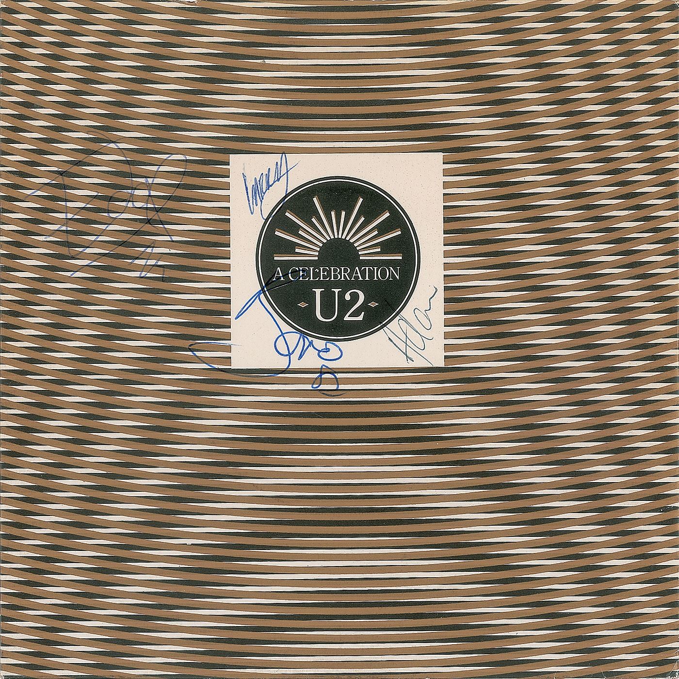 45 RPM single record for 'A Celebration / Trash, Trampoline and the Party Girl,' signed on the front of the sleeve in ballpoint, "Bono, 82," "Larry," "Adam," and "Edge." In fine condition. Accompanied by a full letter of authenticity from REAL.