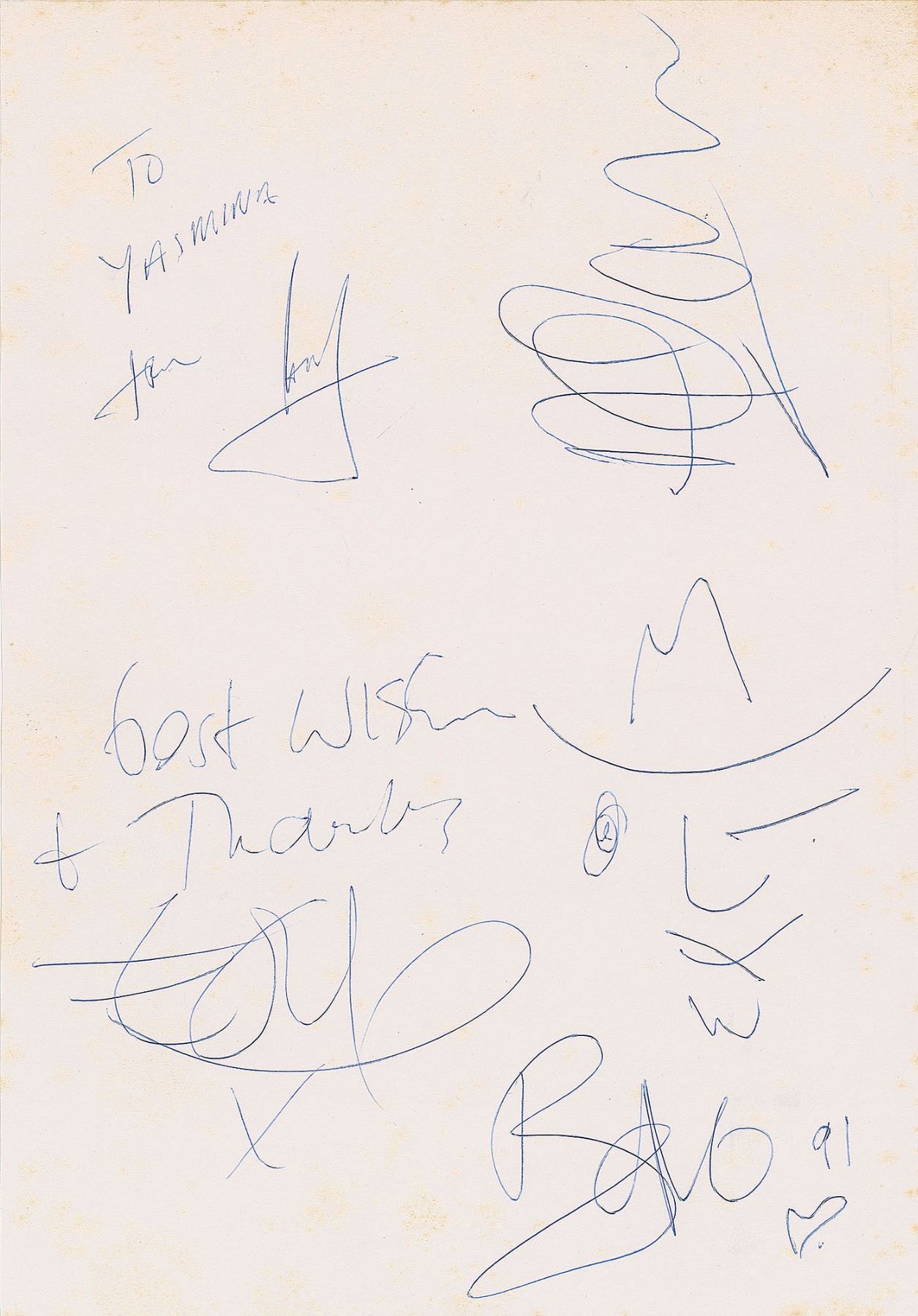 Desirable ballpoint signatures, "Best wishes & thanks, Edge, x," "Adam," "Bono, 91," who adds a heart and self-portrait sketch with a cowboy hat, and "from Larry," who adds an inscription, "To Yasmina," on a white 8.25 x 11.75 sheet. In fine condition, with some small, light edge stains.