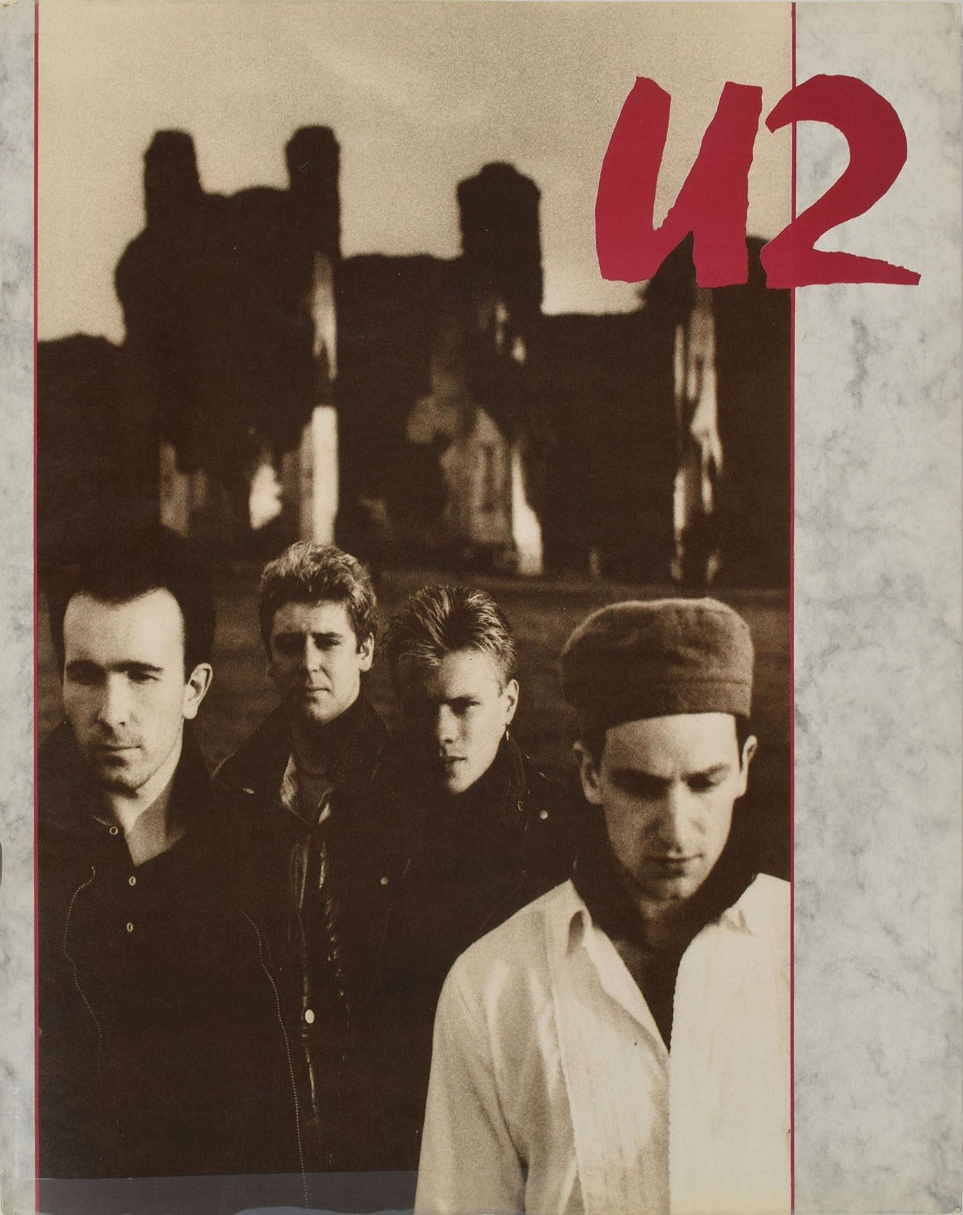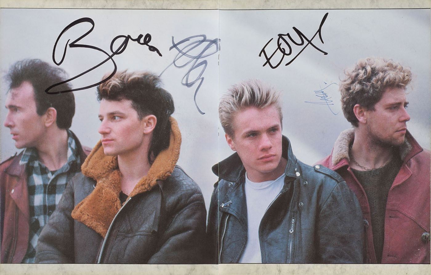 Program for the fifth leg of U2's The Unforgettable Fire Tour, consisting of American dates from February 25 to March 30, 1985, forty-eight pages, 9.75 x 12.25, signed on the centerfold in black felt tip, "Bono," "Adam," "Edge," and "Larry." First page bears an affixed "After Show" pass. In fine condition. Accompanied by a full letter of authenticity from REAL.