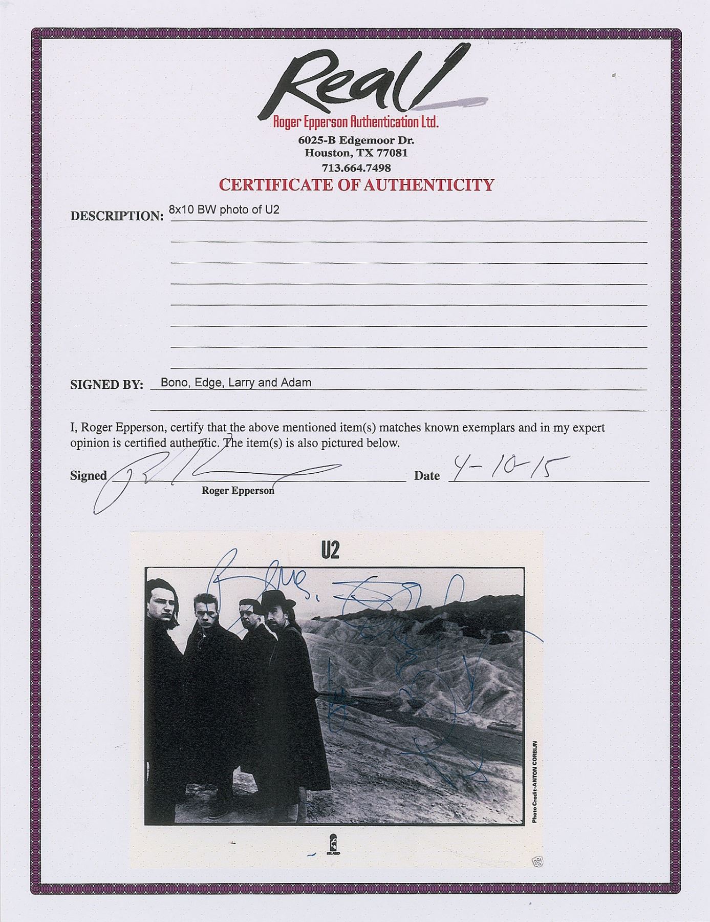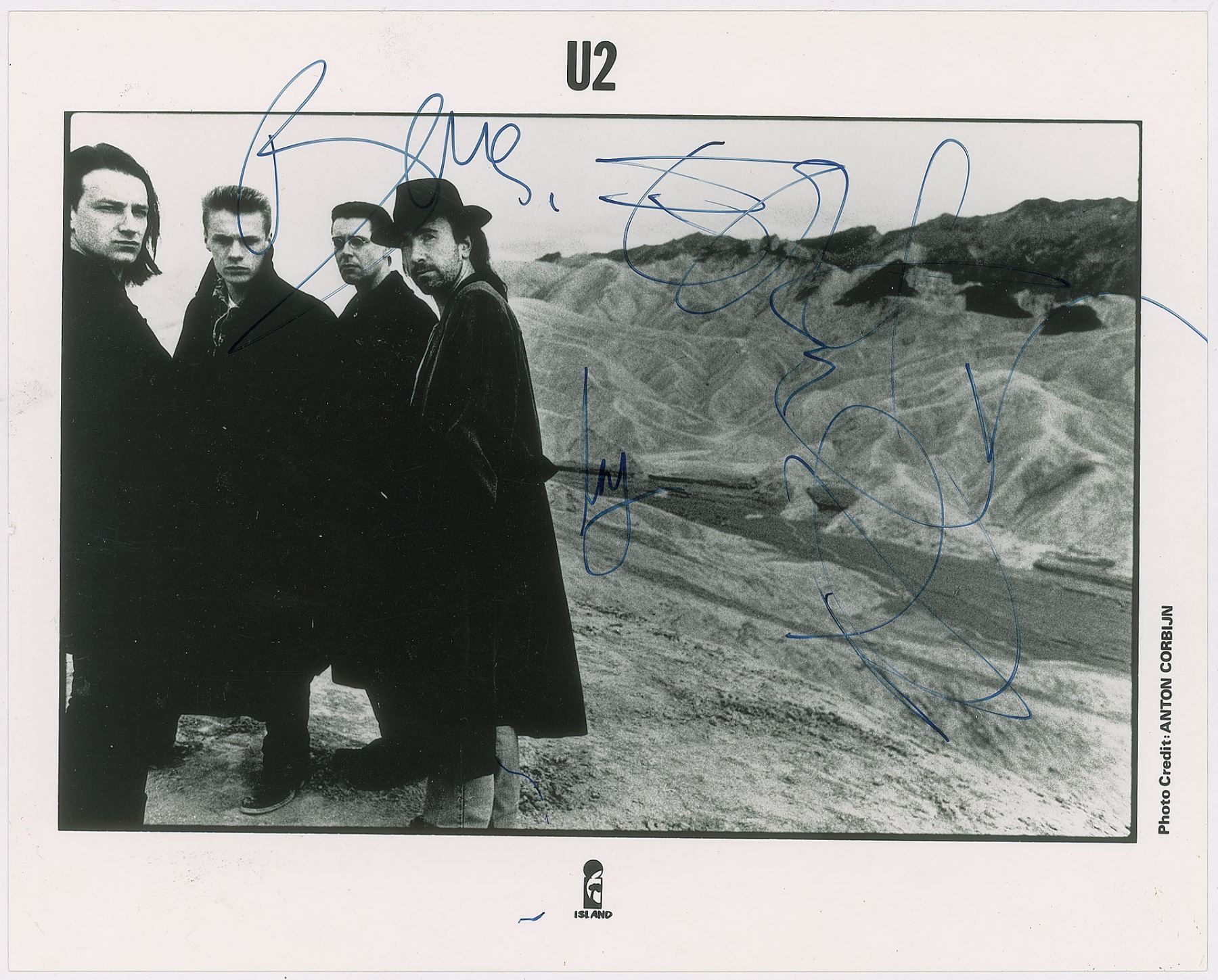 Spectacular glossy 10 x 8 Island Records publicity photo of U2 by Anton Corbijn, fully signed in dark blue felt tip, "Bono," "Edge," "Larry," and "Adam." In fine condition. Accompanied by a full letter of authenticity from REAL. A classic portrait of the band from their famous 'Joshua Tree' photo shoot in Death Valley.