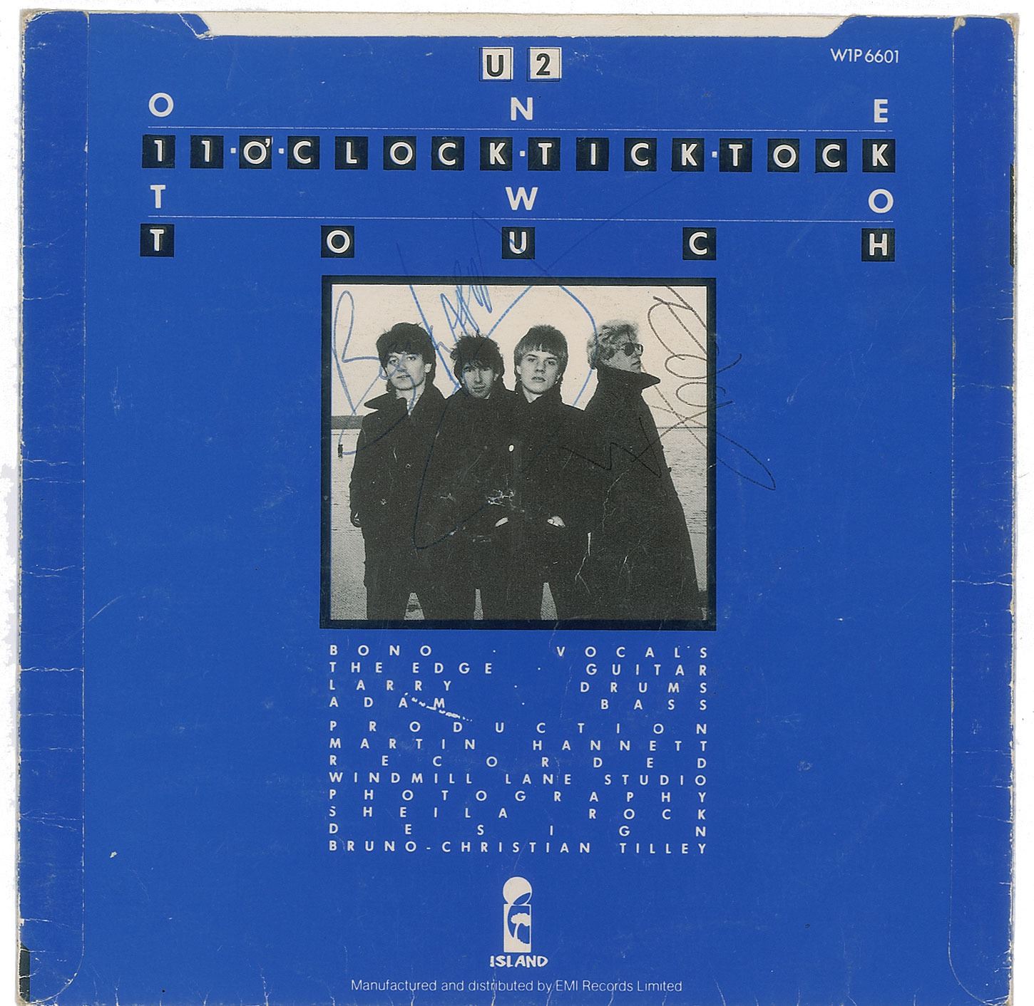 Island Records 45 RPM single for '11 O'Clock Tick Tock / Touch,' signed on the back of the sleeve in blue or black ballpoint, "Bono," "Larry," and "Edge," and on the front of the sleeve in blue ballpoint, "Adam." In very good condition, with creasing, scuffing, and multiple surface dings. The record is not included. Accompanied by a full letter of authenticity from REAL.