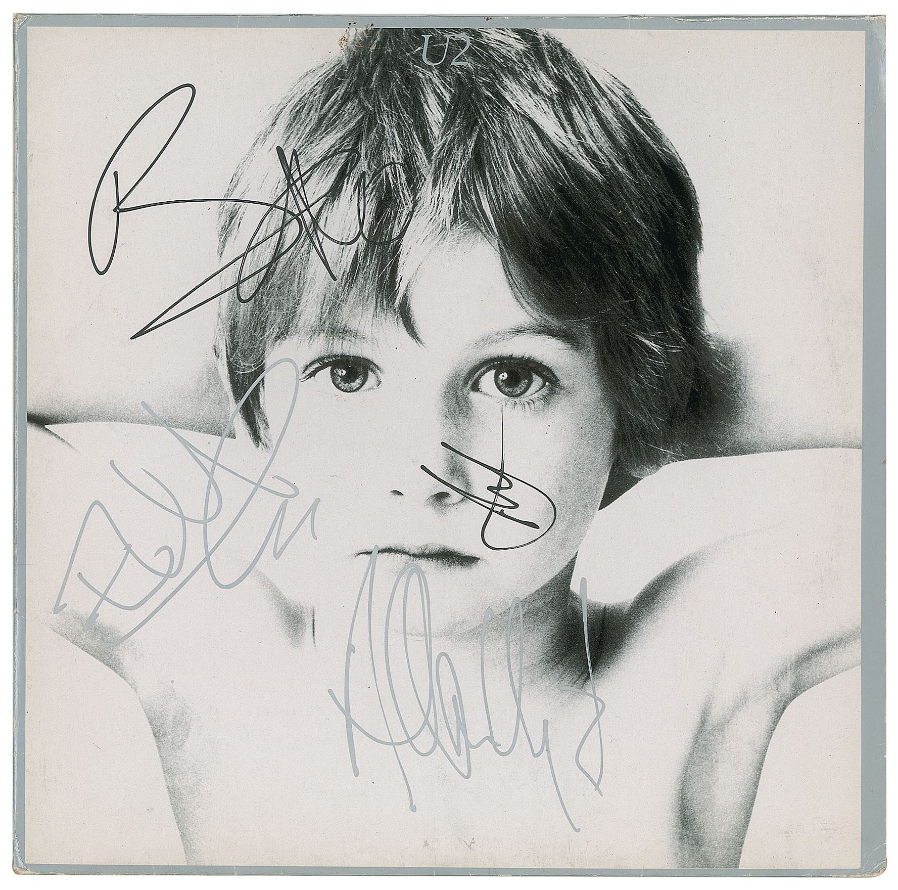 Boy album by U2, signed on the front cover in black felt tip, "Bono" and "Larry," and in silver ink, "Edge" and "Adam Clayton." In fine condition. The record is not included. Consignor notes that the autographs were obtained in Paris in 2005.