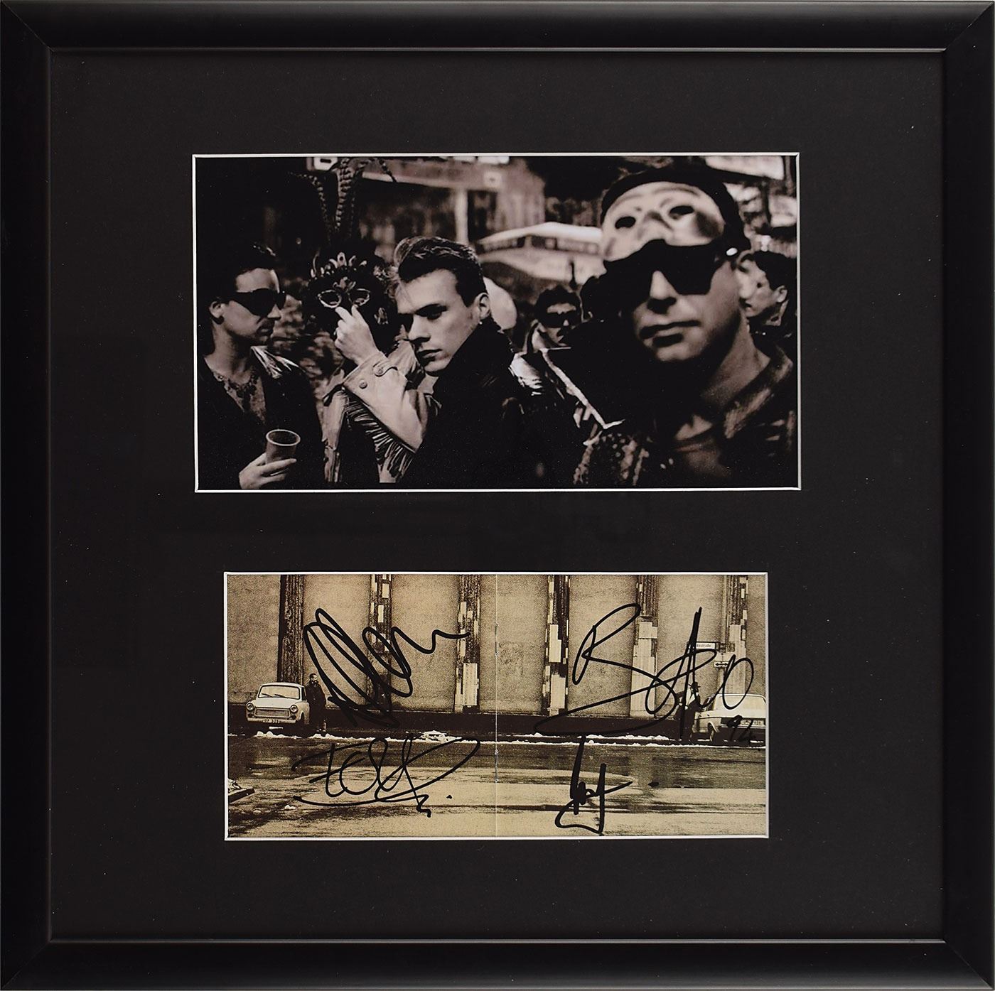 Achtung Baby CD booklet, prominently signed inside in black felt tip, "Bono, 92," "Edge," "Adam," and "Larry." Matted and framed with a portrait to an overall size of 17.25 x 17.25. In fine condition.