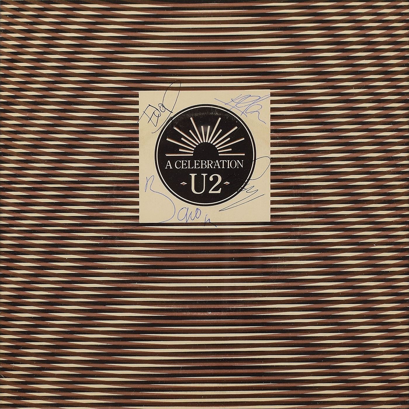 Sleeve for U2's 1982 45 RPM single 'A Celebration,' signed in the early 1980s in ballpoint, "Bono," "Edge," "Larry," and "Adam." Matted and framed to an overall size of 12.25 x 12.25. In fine condition.