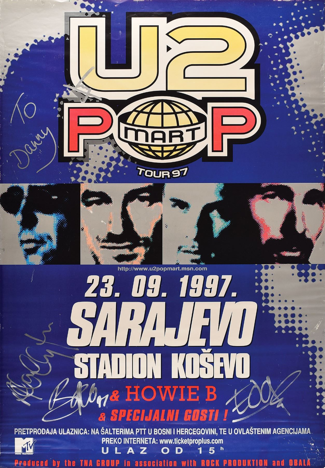 Color 26.75 x 38.5 poster for a U2 concert at Kosevo Stadium in Sarajevo, Bosnia and Herzegovina, on September 23, 1997, as part of their PopMart Tour, signed in silver ink, "Larry," "Adam Clayton," "Bono, 97," and "Edge," with one member adding the inscription: "To Danny." In very good to fine condition, with overall rippling and light edge wear.