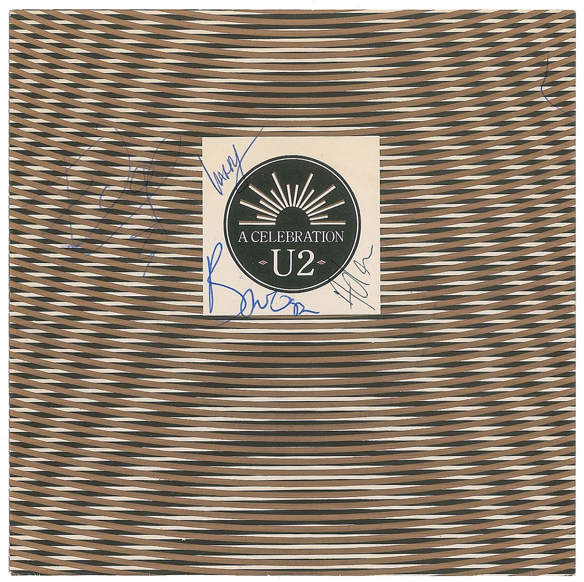 Sleeve for U2's 1982 45 RPM single 'A Celebration,' signed in ballpoint, "Bono," "Edge," "Larry," and "Adam." In fine condition, with moderate contrast to Edge's signature against the busy background. The record is not included.