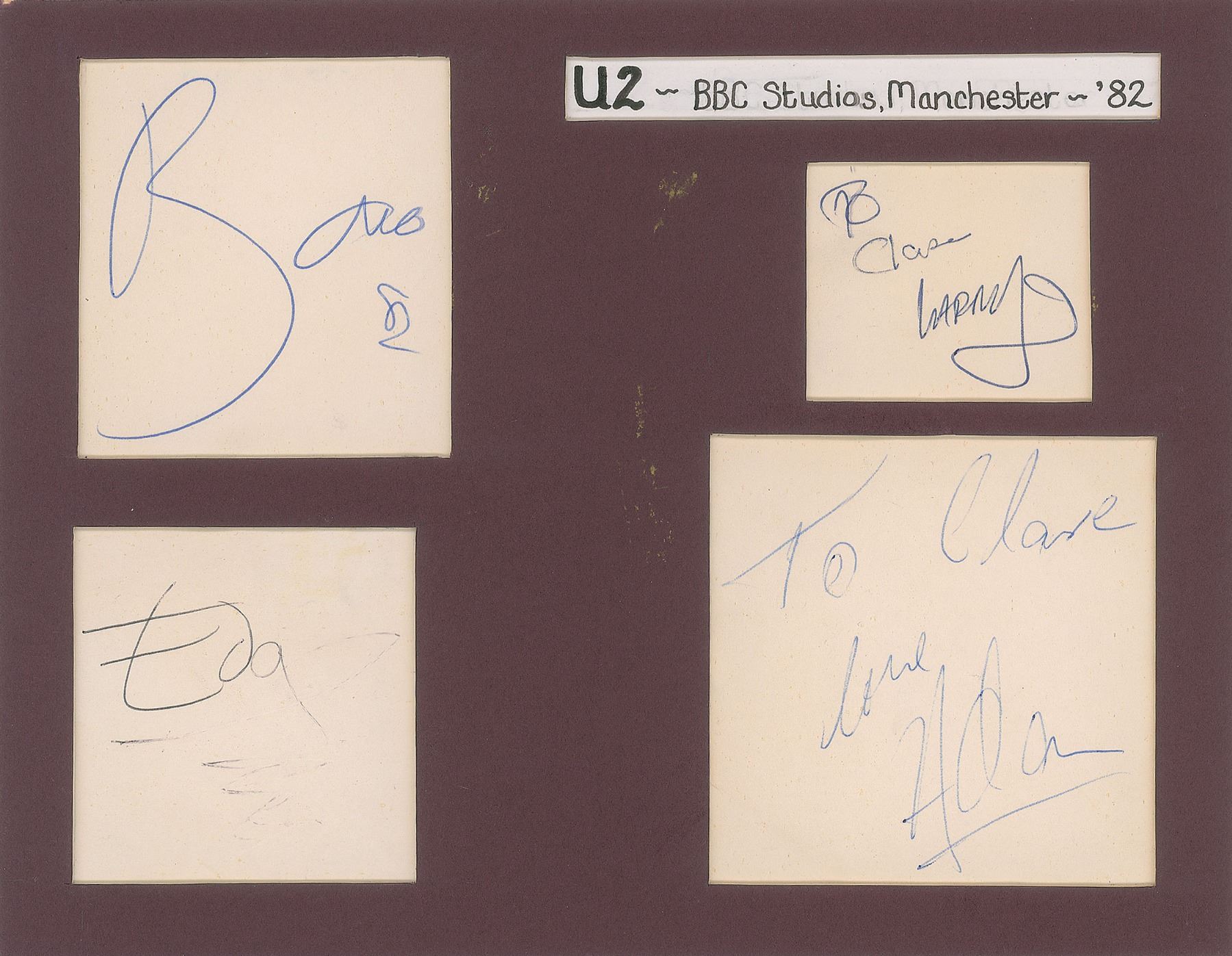 Full set of early ballpoint signatures of U2— “Bono, 82,” “To Clare, Larry,” “Edge,” and “To Clare, love, Adam”— on individual off-white sheets ranging in size from 2 x 1.75 to 3.25 x 3.25; all of which are matted together to an overall size of 9 x 7. In very good to fine condition, with light creasing to Adam's slip, and the end of Edge's signature very light as his pen failed. Accompanied by a certificate of authenticity from Tracks and by a letter of provenance from the original recipient: “I obtained the autographs personally when I met them outside, at the front of the BBC Studios in Manchester in May 1982. They were performing on the Saturday morning ‘Get Set For Summer’ television show. My friend and I used to travel down to meet bands and attend the show’s audience a couple of times. We had never heard of U2 at the time but became fans a few years later as they became more popular in England.”