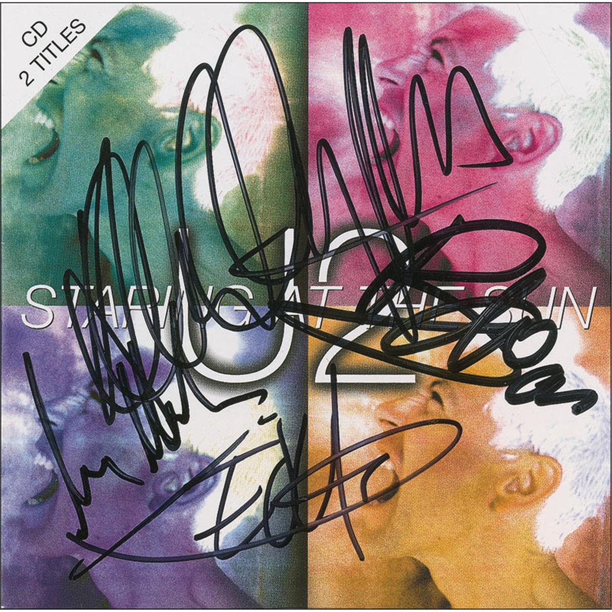 Staring at the Sun CD signed on the front in black felt tip by Bono, The Edge, Adam Clayton, and Larry Mullen, Jr. In fine condition. The CD is included.