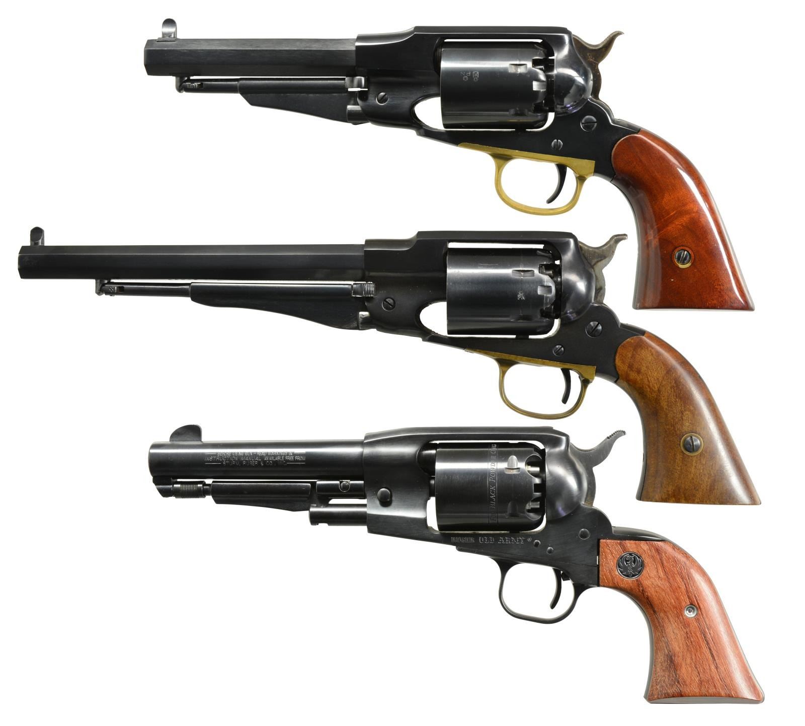 1) UBERTI 1858 NEW ARMY. Cal. 44. S# A46755. Bbl. 5 1/2" oct. w/ post front sight & frame notched rear. Brass trigger guard, case colored hammer & gloss finished hardwood grips. Mfg. 2004 in Italy. CONDITION: very faint marks by cyl. notches; all other aspects near excellent including bore & grips. (01-18119/NW). ANTIQUE. 2) ASM NEW MODEL ARMY. Cal. 44. S# 80633. Bbl. 8" w/ post front sight & frame notched rear. Mfg. 1983 w/ brass trigger guard & satin finished walnut grips. CONDITION: very good general appearance w/ patina trigger guard. Slight gap to frame on edges of grips. Occasional sm. spots of peppery oxidation plus evidence on firing on face of cyl. leaving light pitting & faint oxidation. Good plus bore w/ areas of light pitting. (01-18120/NW). ANTIQUE. 3) RUGER OLD ARMY. Cal. .45. S# 148-00260. Bbl. 5 1/2" w/ blade front sight & frame notched rear. Mfg. 1994 w/ catalog # BP5F. Scarce blued fixed sight model having rosewood grips w/ silver eagle medallions. Mfg. to meet desires of cowboy action shooters; discontinued 2009. UNATTACHED ACCESSORIES: original matching gray plastic case w/ packaging plus aftermarket imitation ivory grips & auxiliary cyl. to utilize 45 Colt metallic cartridges (appears unused). CONDITION: all aspects near excellent including bore & chambers. PROVENANCE: The Estate of Richard Willman. (20-3016/NW). MODERN. $800-1,200.