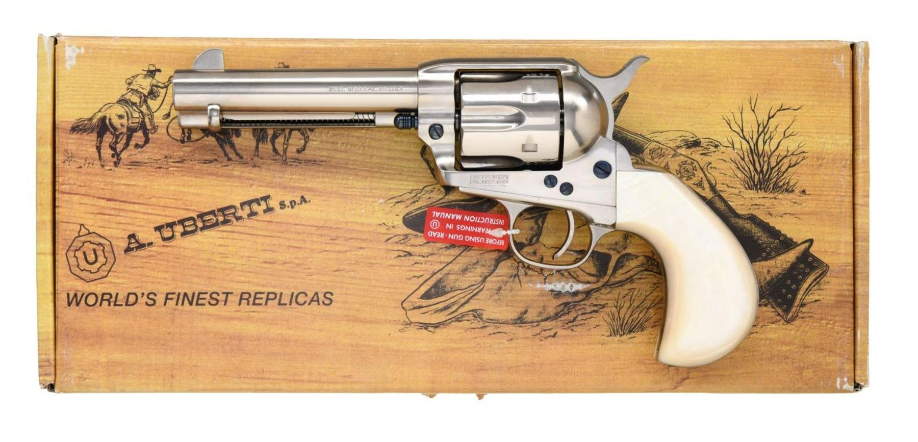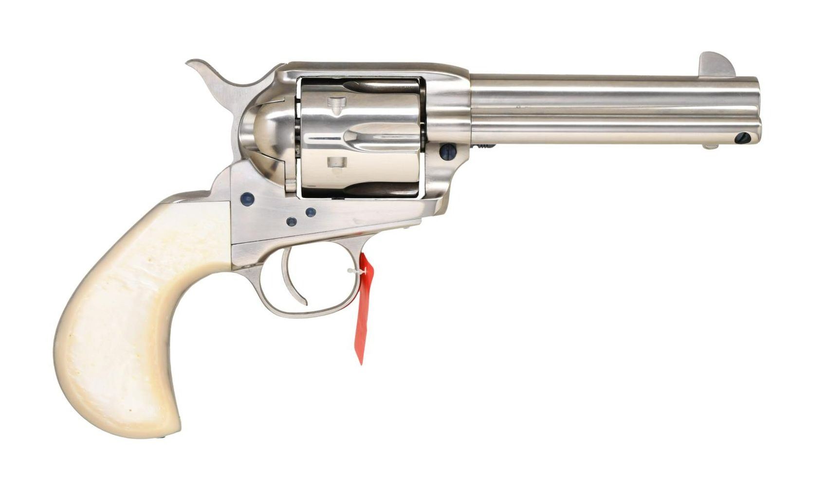 Cal. 45 Colt. S# UX5108. Bbl. 4 1/2". Blade front sight. Fixed rear sight. Nickel finish w/ fire blued screws. Simulated Pearl grips. UNATTACHED ACCESSORIES: matching numbered factory box w/ manual & cable lock. CONDITION: all aspects near excellent. PROVENANCE: the Collection of Gun Sport Ltd owned by Jon R. Thomas. (23-2757/MJC). MODERN. $500-800.