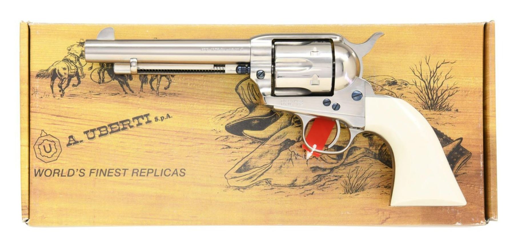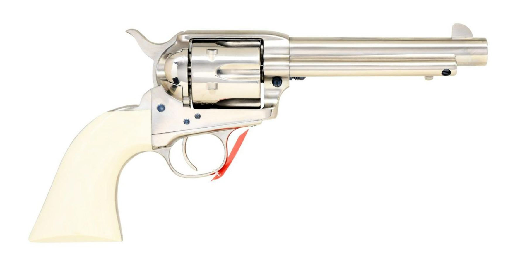 Cal. 45 Colt. S# UX0870. Bbl. 5 1/2". Fixed front sight & fixed rear sight. Cody model Cattleman revolver. Nickel finish w/ fire blued screws. Simulated ivory grips. UNATTACHED ACCESSORIES: matching numbered factory box w/ cable lock & paperwork. CONDITION: all aspects are near new in the box. PROVENANCE: the Collection of Gun Sport Ltd owned by Jon R. Thomas. (23-2832/MJC). MODERN. $400-600.