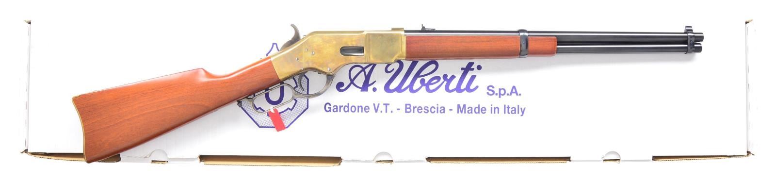 Cal. 45 Colt. S# W95112. Bbl. 19" with leaf rear sight. 2 Band rifle with carbine length forearm. Brass frame & buttplate. Case colored hammer & lever. Walnut 2 piece stock set. UNATTACHED ACCESSORIES: original box & paperwork. CONDITION: overall very fine with a few scattered light handling marks. Bright shiny bore with sharp rifling. Original warning tag remains on lever. Box is in fair shape with some minor tattering. (22-4039/ZAL). CURIO. $700-1,000.
