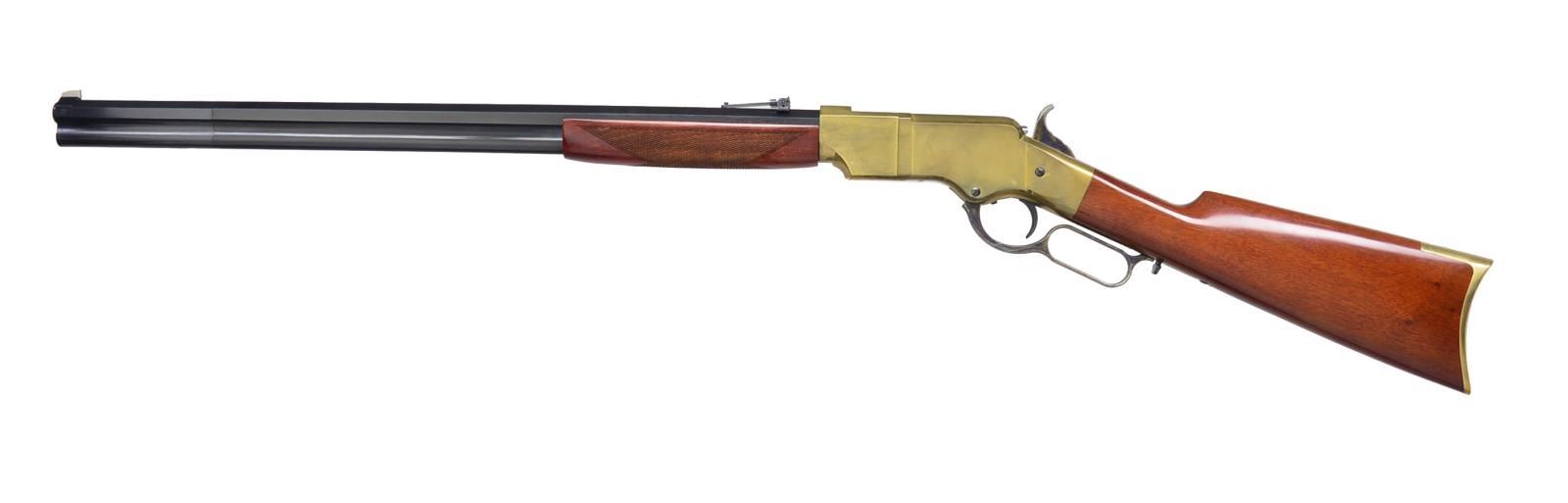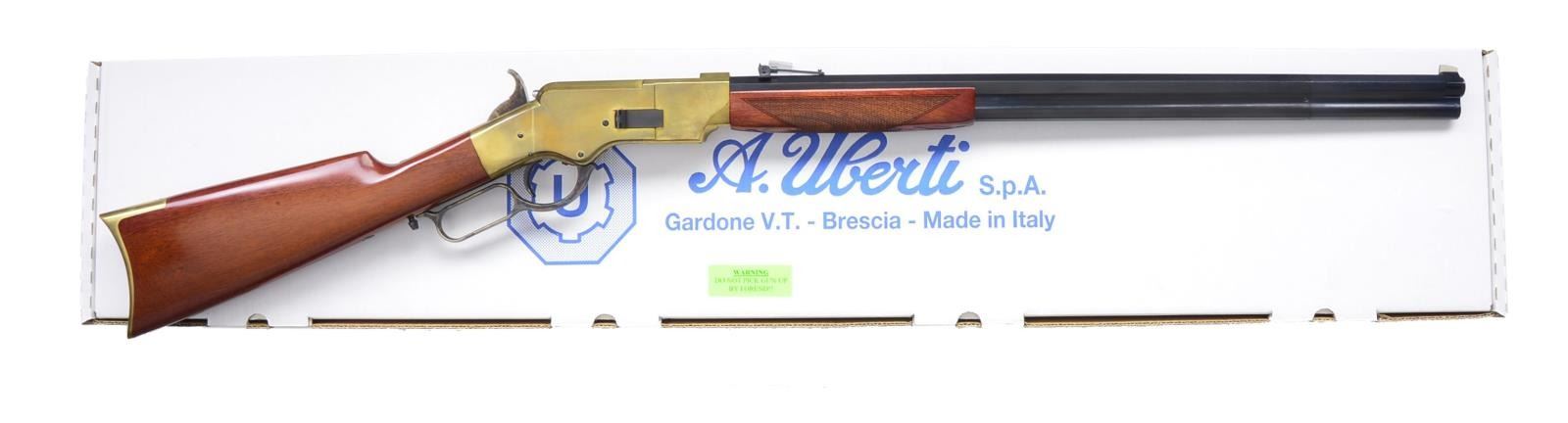 Cal. 45 Colt. S# W18322. Bbl. 24". Blade front sight w/ graduated leaf rear sight. Brass action w/ blued transition style loading gate. Case colored hammer & lever. Mag. is built integral w/ bbl. Transition feature checkered walnut forearm that has unsecured fit over mag. tube. Straight grip walnut stock w/ trapdoor buttplate. Mfg. in Italy & imported by Taylor's & Co., Winchester, VA. UNATTACHED ACCESSORIES: original box & shipping carton contains safety manual, instructions & Uberti catalog. CONDITION: near new retaining 99% finish. Near excellent bore. (20-4133/DS). MODERN. $700-1,000.