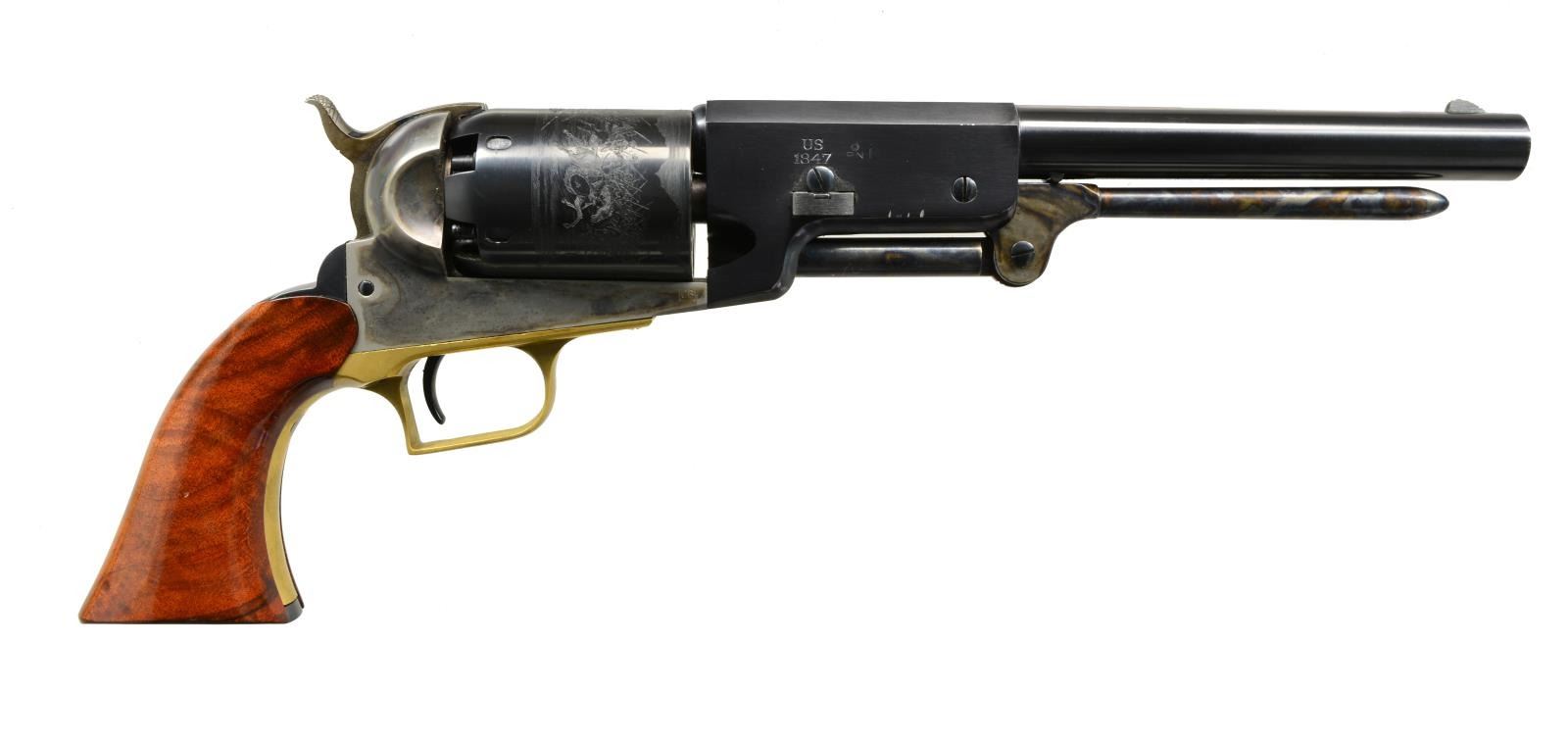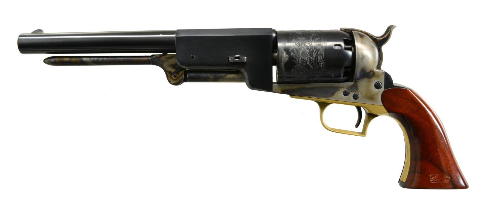 Cal. 44. S# A63038. Bbl. 9" rnd. w/ oct. shank & blade front sight. 6 Shot rnd. roll engraved cyl. Case colored frame, hammer & loading lever. Brass square back trigger guard. 1 Piece grip of fancy walnut having "APC" cartouche on left panel. CONDITION: bbl. & cyl. retain 98% blue showing 3 sm. dents on left side of bbl. flat. Action has lightly faded case colors. Grips show light handling marks. Sound mechanics. Very good bright bore. (01-17734/DS). ANTIQUE. $250-350.