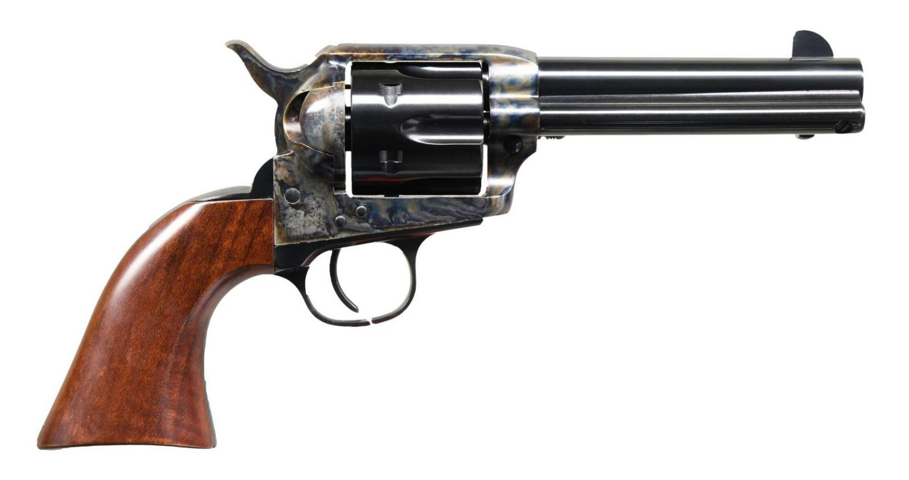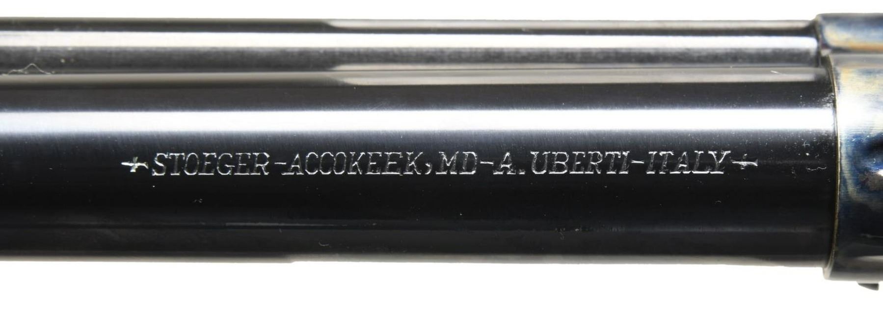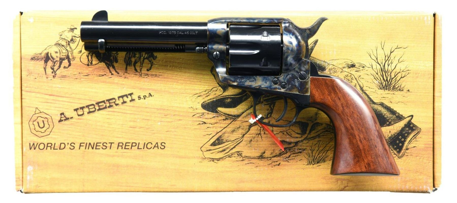 WITH MATCHING FACTORY BOX. Cal. 45 Colt. S# UY7475. Bbl. 4 3/4". Model 1873 Cattleman SA revolver mfg. by Uberti in Italy and imported by Stoeger of Accokeek, MD. Top of bbl. exhibits Stoeger's importer and Uberti's mfg. information, with the left side being marked with the model and cal. designations. Left side of frame is marked with "patent" information. Case color hardened frame, loading gate, and hammer, with blued cyl., bbl., ejector rod housing, backstrap, and trigger guard. Frame is mounted with a 1 piece smooth wood grip. UNATTACHED ACCESSORIES: matching factory box. CONDITION: near new, with metal components retaining virtually all of their original factory finishes overall. Mirror bore, exhibiting well defined rifling throughout. Wood grip is excellent. Box shows some mild exterior wear, but otherwise remains sturdy and serviceable. PROVENANCE: The Collection of Gun Sport Ltd owned by Jon R. Thomas. (23-2739/MLW). MODERN. $300-500.