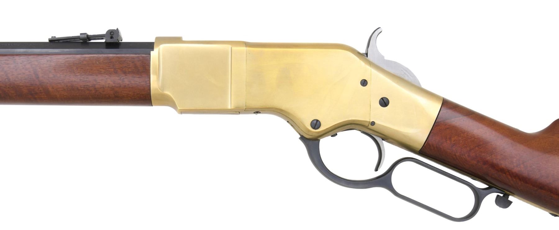 Cal. 44/40. S# 59890. Bbl. 24", octagonal. Blade front sight. Ladder rear sight graduated to 800yds. Bbl. has Cabelas Sidney, NE marking. Brass frame, buttplate, and nosecap. Balance of other parts has a blued finish. Walnut stock set. CONDITION: stock set appears to be near excellent with very few minor handling marks. Brass parts show some light scratches and handling marks. Blued parts retain 98% of their original finish with a couple light handling marks. Action functions properly when hand-cycled. Bright, near excellent bore. (24-5683/MJC). MODERN. $700-1,000.