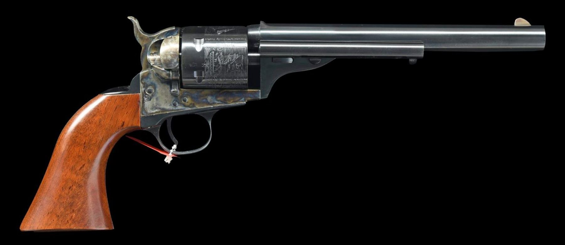 Cal. 45 Colt. S# X68603. Bbl. 7 1/2". Blade front sight. Fixed rear sight. Case colored hammer, loading gate, & frame. Other parts are blued w/ navy scene on cyl. Walnut grips. UNATTACHED ACCESSORIES: matching numbered factory box w/ manual, paperwork, & cable lock. CONDITION: all aspects near new, in the box. PROVENANCE: the Collection of Gun Sport Ltd owned by Jon R. Thomas. (23-2755/MJC). MODERN. $500-700.