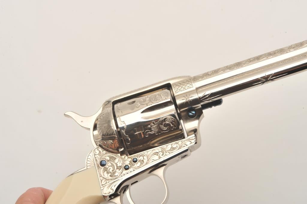 Uberti Single Action Revolver factory exhibition and display gun, fully and finely master hand engraved in 19th century, Nimschke style with fine scrolls, cross hatching ropes and borderwork inspired byL.D. Nimschke's work on Colts in 1870's-1880"s. Nickel finish with bright blue screws and 1 pc simulated ivory screwless grips. Shows "Uberti USA, Lakeville, CT Made in Italy" address. Excellent used condition.97-99%. The best Uberti we have seen as far as fine "old style" engraving. Est:$1000-2000