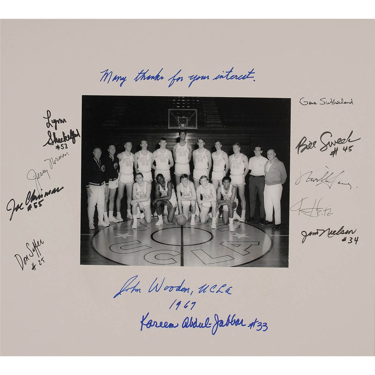Satin-finish 10 x 8 photo of the 1967 UCLA basketball team affixed to an 18 x 16 white cardstock mount, signed on the mount in felt tip and ballpoint by Kareem Abdul-Jabbar, John Wooden, Lynn Shackelford, Bill Sweek, Ken Heitz, Jerry Norman, Gene Sutherland, Don Saffer, Joe Chrisman, Jim Nielsen, and Neville Saner, with most adding their number and Wooden adding, “Many thanks for your interest” at the top. In fine condition.