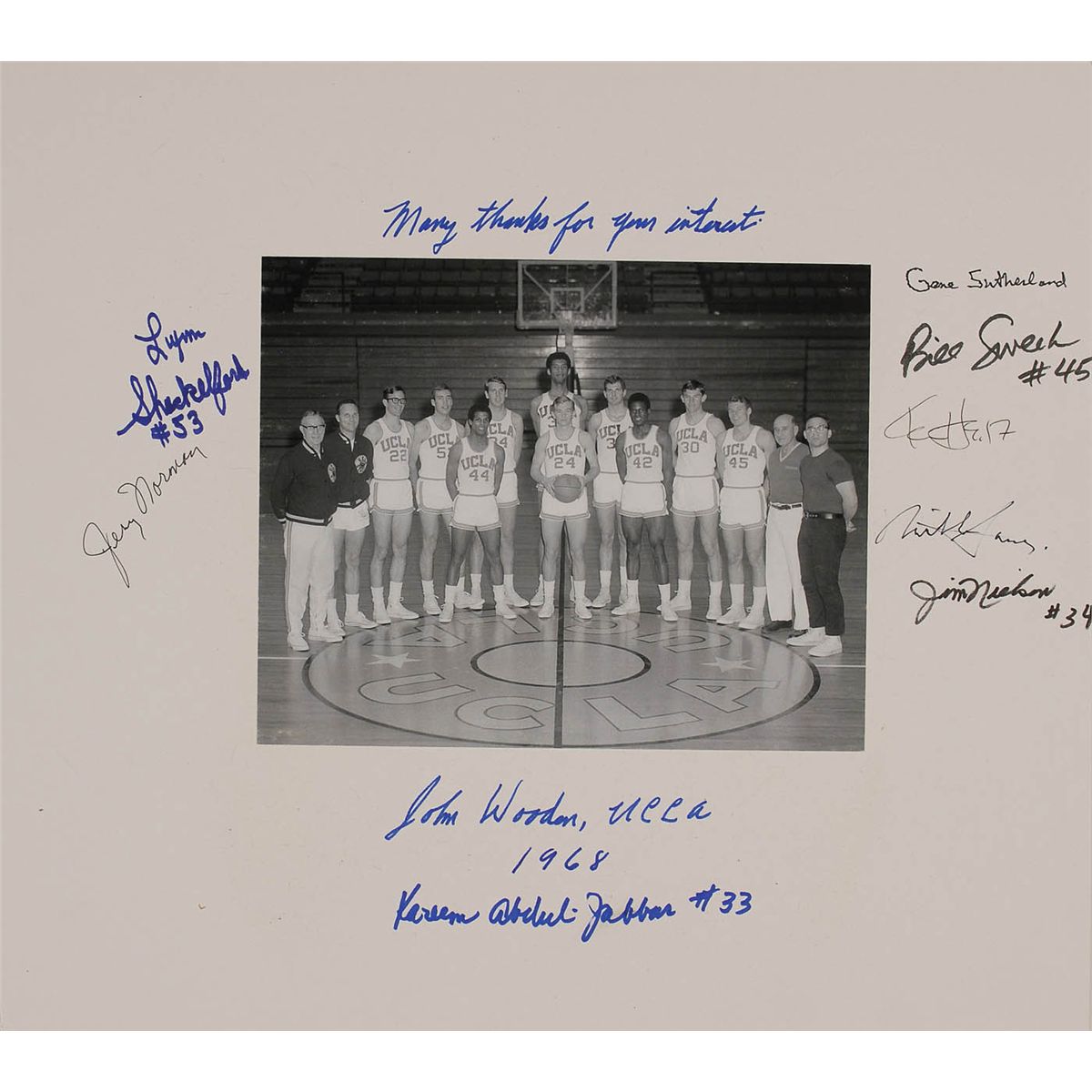 Satin-finish 10 x 8 photo of the 1968 UCLA basketball team affixed to an 18 x 16 white cardstock mount, signed on the mount in felt tip and ballpoint by Kareem Abdul-Jabbar, John Wooden, Lynn Shackelford, Bill Sweek, Ken Heitz, Jerry Norman, Gene Sutherland, Jim Nielsen, and Neville Saner, with most adding their number and Wooden adding, “Many thanks for your interest” at the top. In fine condition.