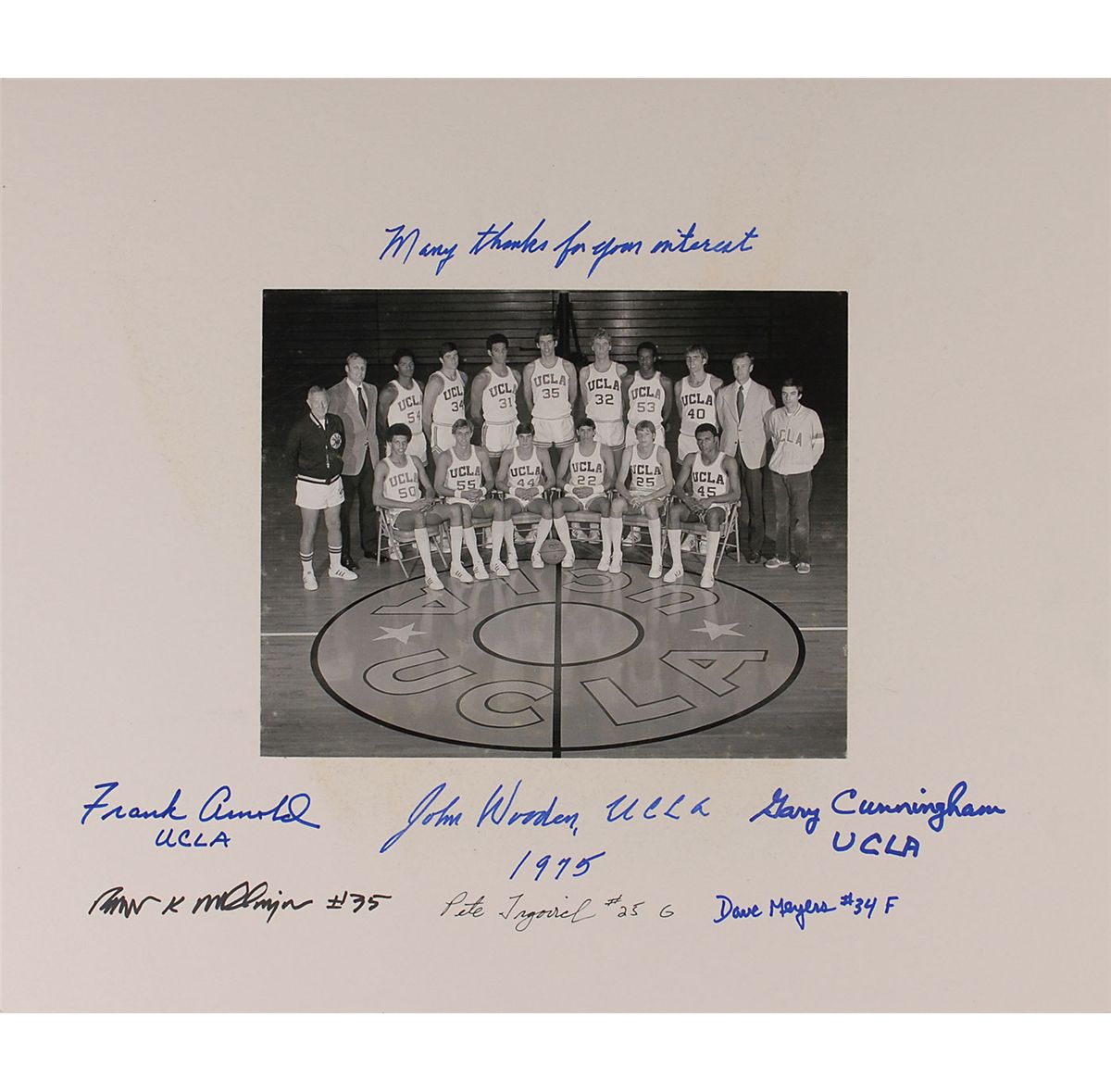 Satin-finish 10 x 8 photo of the 1975 UCLA National Championship basketball team, affixed to a 19 x 16 white mount, signed in blue and black felt tip on the mount by coach John Wooden, coach Frank Arnold, coach Gary Cunningham, Dave Meyers, Pete Trgovich,