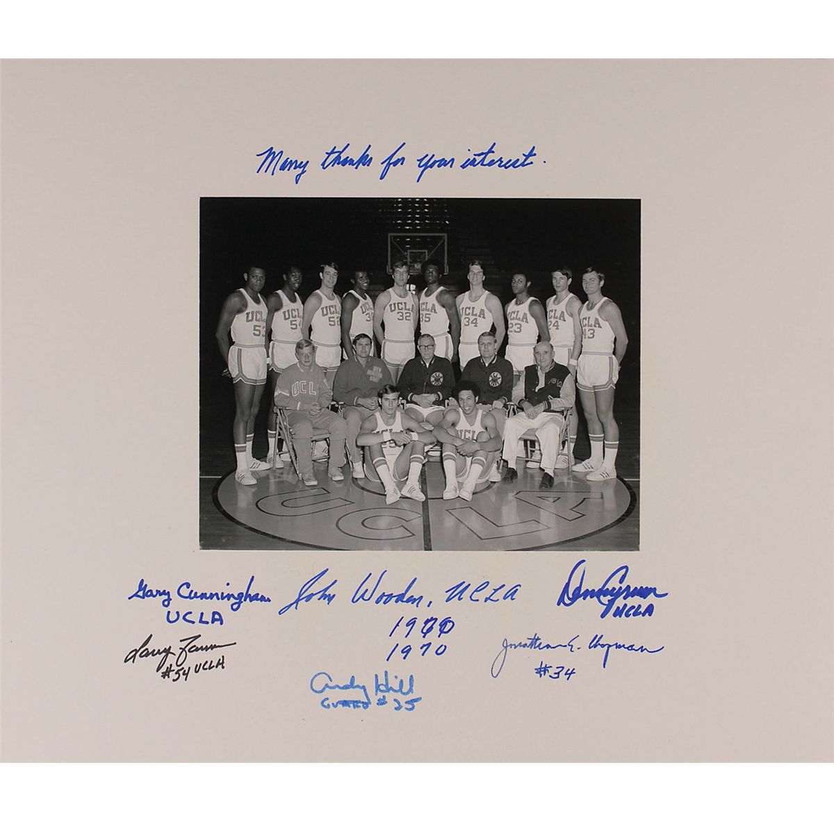 Satin-finish 10 x 8 photo of the 1970 UCLA National Championship basketball team, affixed to a 19 x 16 white mount, signed in blue and black felt tip on the mount by coach John Wooden, coach Gary Cunningham, coach Denny Crum, Andy Hill, Larry Farmer, and Jonathan Chapman. Wooden also adds a brief sentiment above the photo, as well as the team’s year underneath (initially misidentifying the year). In fine condition.