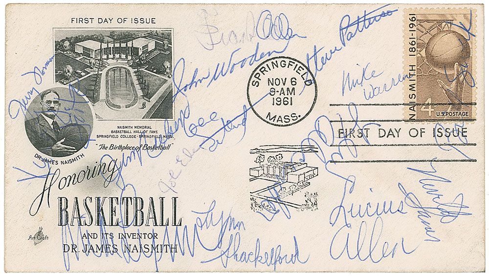 Vintage FDC with a cachet honoring basketball, signed in blue ballpoint by the 1967–68 UCLA Bruins men's basketball team. Signers are: Lew Alcindor, John Wooden, Lucius Allen, Kenny Heitz, Mike Lynn, Jim Nielsen, Lynn Shackelford, Mike Warren, Jerry Norman, Gene Sutherland, Bill Sweek, Neville Saner, Steve Patterson, and Frank Adler. In fine condition, with skipping to ink of a few signatures. A scarce example of the full 1967–68 team featuring the desirable early signature of Kareem Abdul-Jabbar.