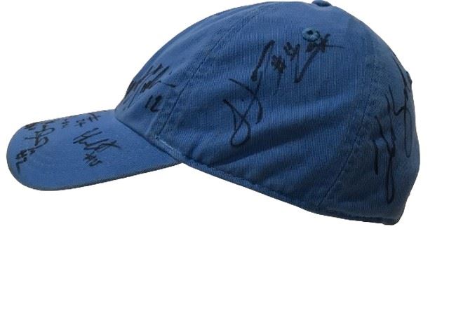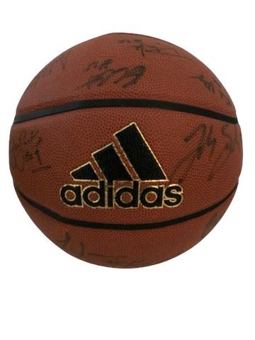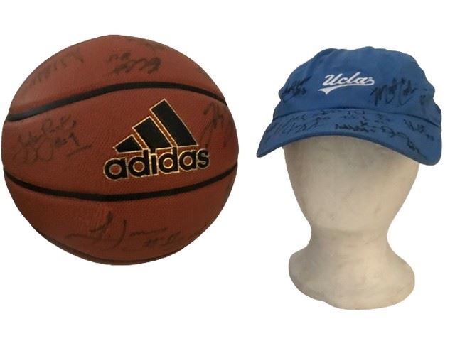 Adidas orange leather basketball signed by Ben Howland, and players #11, #5, #21, #34, #14, #20, #0, #24, #2, #1. Also includes a blue UCLA Adidas baseball cap with embroidered Adidas and UCLA logos signed by Ben Howland, Scott Duncan and others.