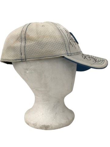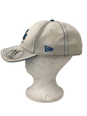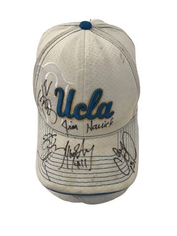 UCLA coaches signed white and blue New Era 39 Thirty Official UCLA Bruins basketball licensed baseball cap with blue and gold embroidered lettering on front and rear. Sized L-XL.