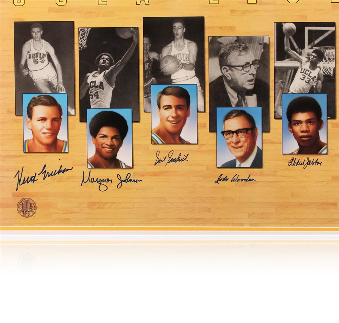 This limited edition lithograph is signed by UCLA Legends: Kareem Abdul-Jabbar, Bill Walton, Gail Goodrich, Marcus Johnson, Keith Ericson, Mike Warren, and coach John Wooden. Comes with Certificate of Authenticity.