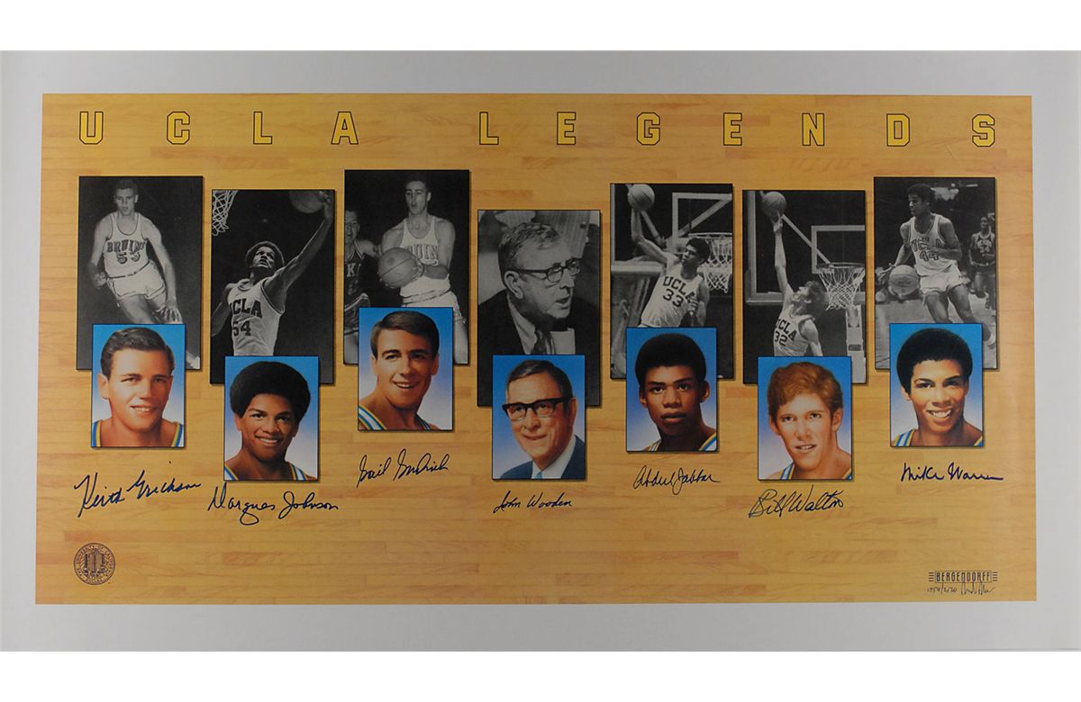 Color limited edition 40 x 22 print entitled ‘UCLA Legends,’ numbered 1354/2500, signed in blue felt tip by Keith Erickson, Marques Johnson, Gail Goodrich, John Wooden, Kareem Abdul-Jabbar, Bill Walton, and Mike Warren. Also signed in the lower right by the artist, Roger Bergendorff. Rolled and in fine condition.