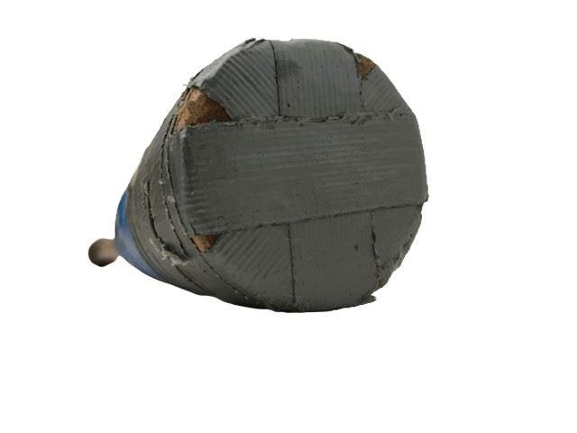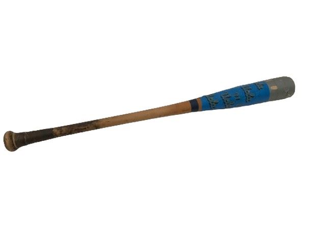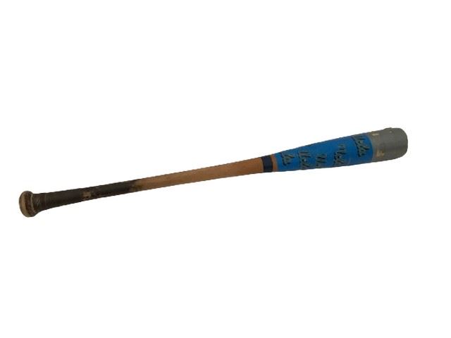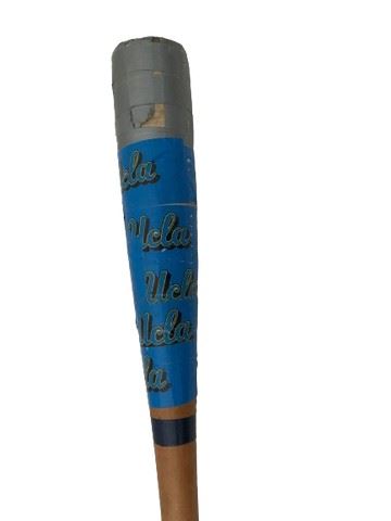 Weighted training bat. Head is wrapped with silver and blue UCLA duct tape covering manufacturers markings; manufacturer unknown.