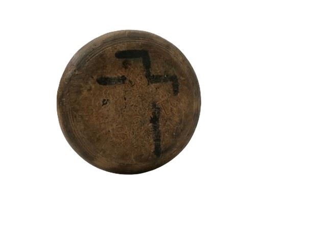 Dark staining on handle from use; black cross marks the bottom of knob.