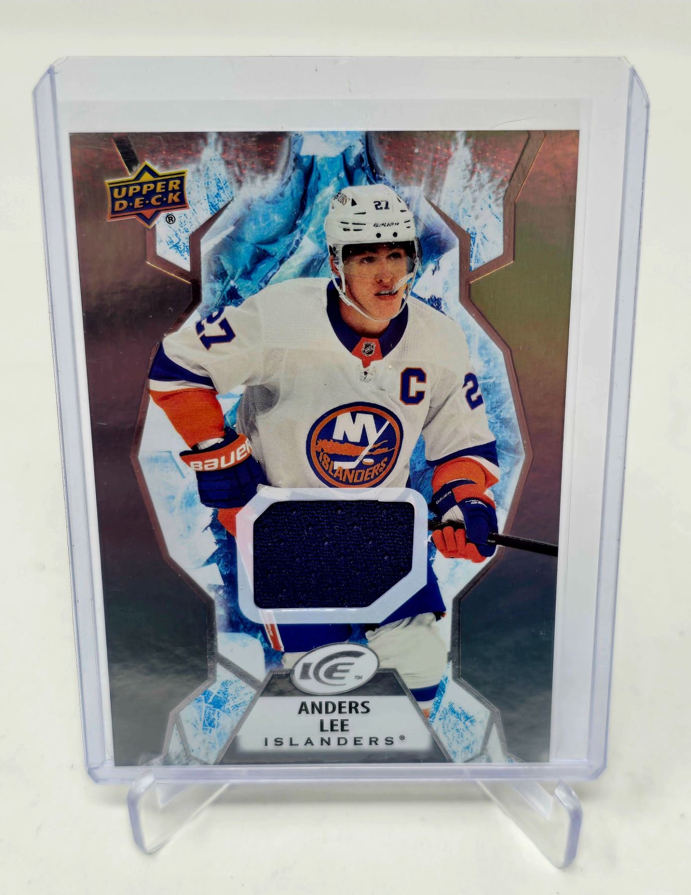 5-card NHL lot featuring two jersey cards: Oskar Steen UD ICE Premieres and Anders Lee UD ICE relic. Also includes a Grigori Denisenko Premieres Rookie #/799, a gold surge OPC Platinum Marquee Rookie of Thomas Bordeleau, and a base Trevor Zegras Marquee Rookie. Clean collector lot with solid rookie and memorabilia value.