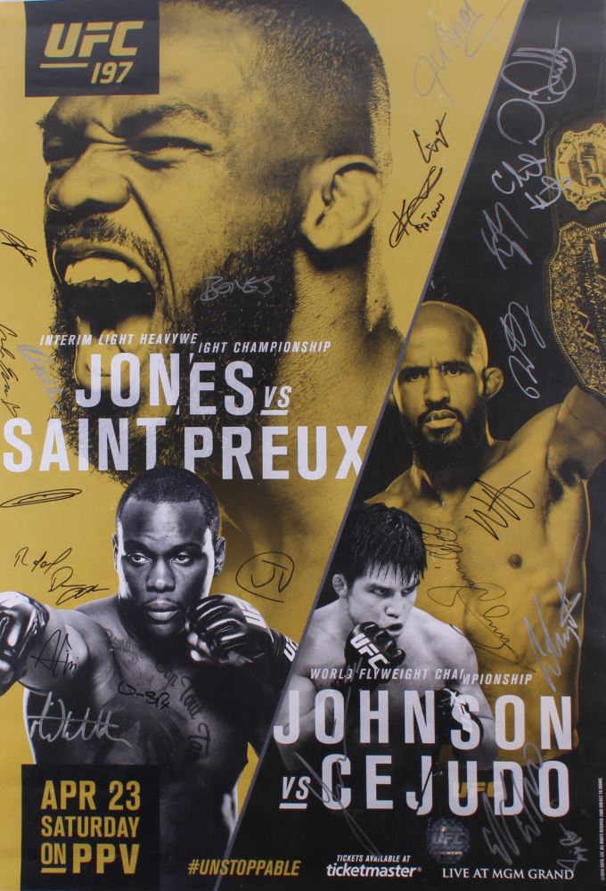 Poster measures 27" x 39" in size and has been hand-signed in black felt-tip pen and silver paint pen by (24) fighters including Jon Jones, Ovince Saint Preux, Demetrious Johnson, Henry Cejudo, Edson Barboza, Anthony Pettis, Robert Whittaker, Rafael Natal, Yair Rodriguez, Andre Fili, Sergio Pettis, Chris Kelades, Danny Roberts, Dominique Steele, Carla Esparza, Juliana Lima, James Vick, Glaico Franca, Walt Harris, Cody East, Marcos Rogerio De Lima, Clint Hester, Kevin Lee, and Efrain Escudero. Please note, the poster has wear and tear around the edges that can not be seen once framed.