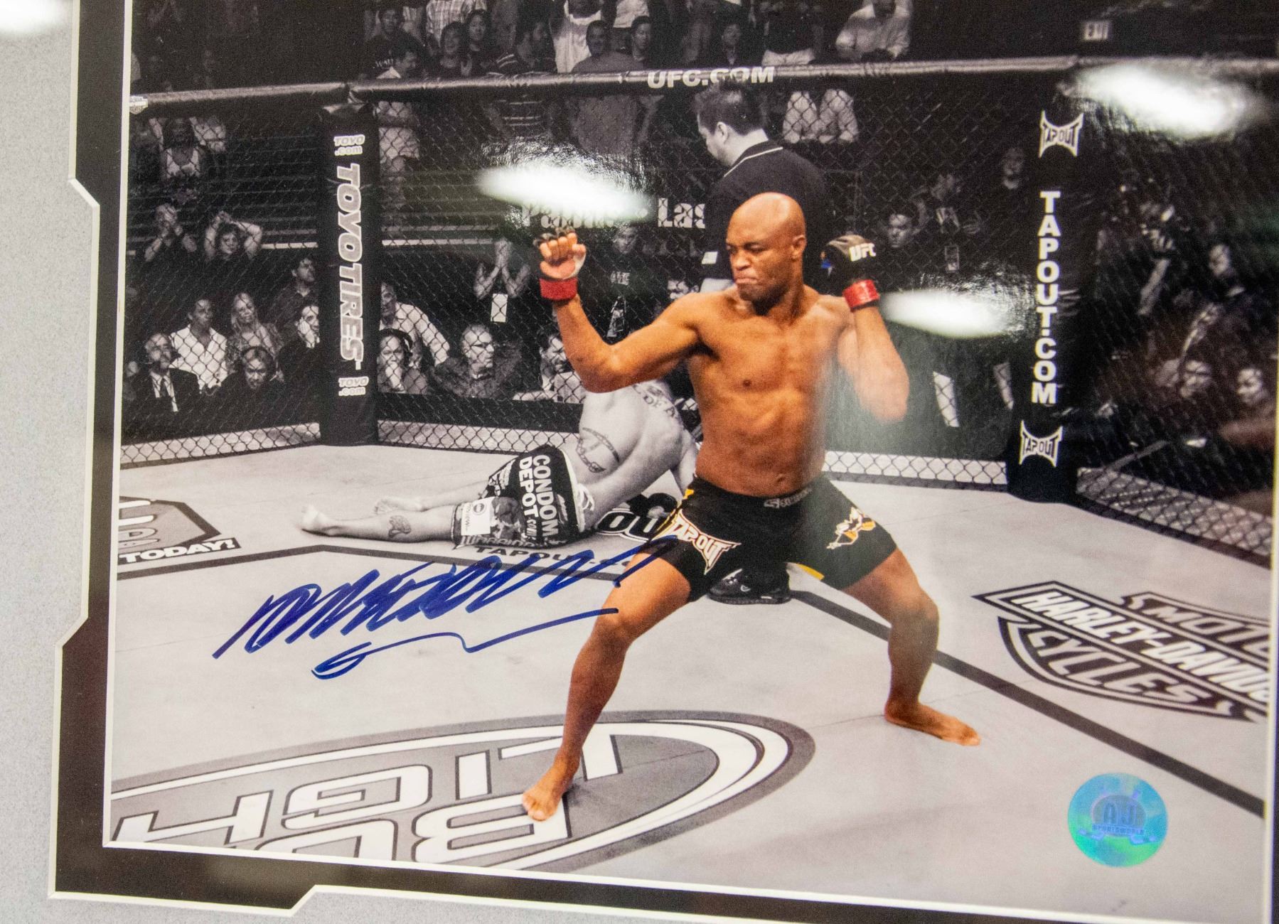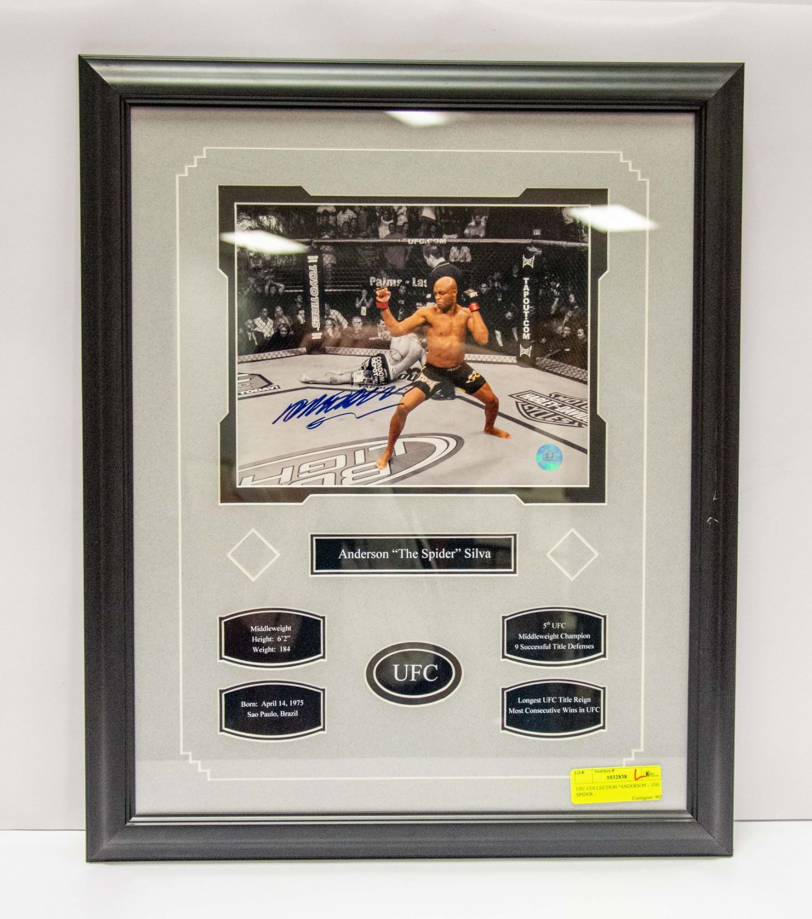 SILVA" PROFESSIONALLY FRAMED - SIGNED - FIGHT ACTION PHOTO WITH STATISTICS AND NAME PLATE (19"L X 23"H)
