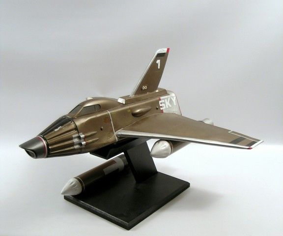 UFO British TV Series Studio Replica Sky 1 Jet Model - From the beloved imagination of Gerry Anderson, who gave us the astonishing puppet clad "Thunderbirds", as well as the live action "Space: 1999", came another cult favorite, the live-action Sci-Fi series UFO (1969-1973). The story of an alien invasion of Earth (they need our body parts!), human pilot Skydivers are sent out in their decked-out fighter jets known as "Sky 1", to intercept the aliens and do battle before they come to Earth. This is a beautifully realized model Sky 1 from the English studio that produced the series, and was made by industry modelers. Approx 17"x26". (Please note that this item appears to be quite old, has some minor damage from use and the model missile needs to be reattached).